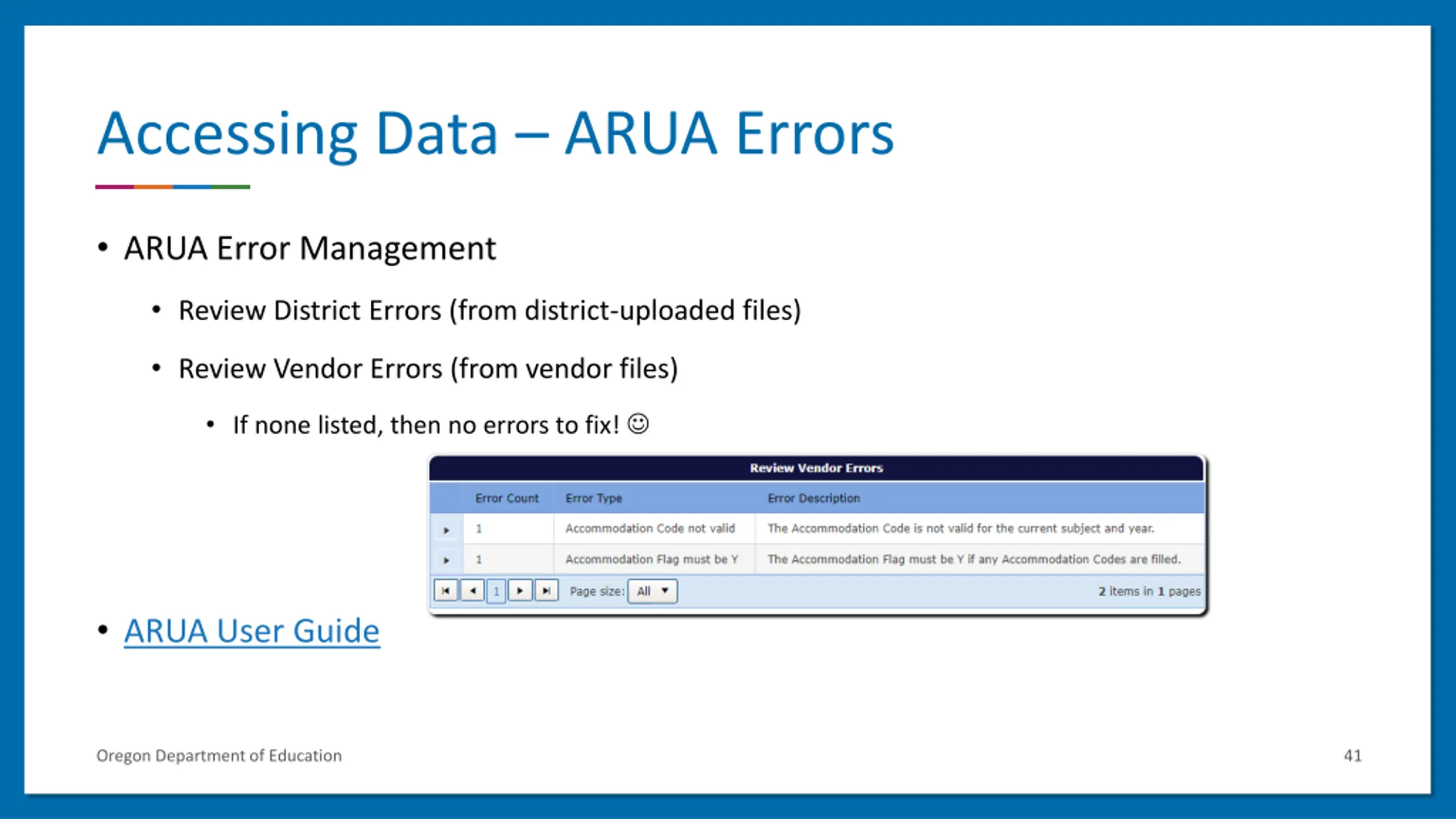 Accessing Data ARUA Errors ARUA Error Management Review District Errors (from district-uploaded files) Review Vendor Errors (from vendor files) If none listed, then no errors to fix! ARUA User Guide Oregon Department of Education 41