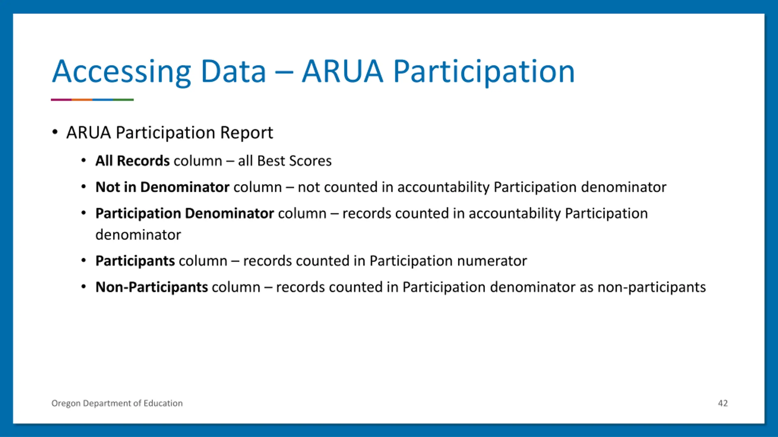 Accessing Data ARUA Participation ARUA Participation Report All Records column all Best Scores Not in Denominator column not counted in accountability Participation denominator Participation Denominator column records counted in accountability Participation denominator Participants column records counted in Participation numerator Non-Participants column records counted in Participation denominator as non-participants Oregon Department of Education 42