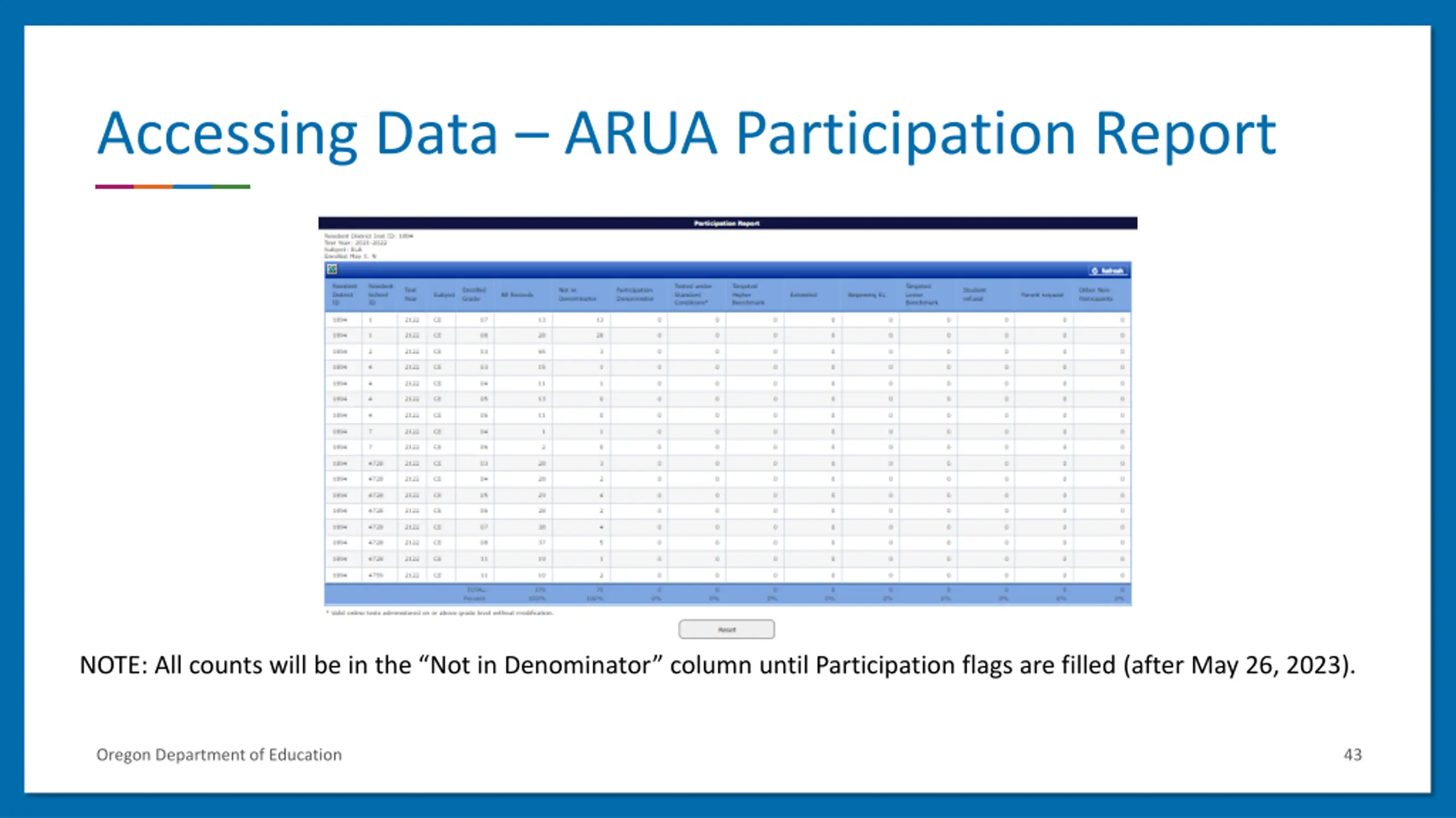 Accessing Data ARUA Participation Report NOTE: All counts will be in the Not in Denominator column until Participation flags are filled (after May 26, 2023). Oregon Department of Education 43