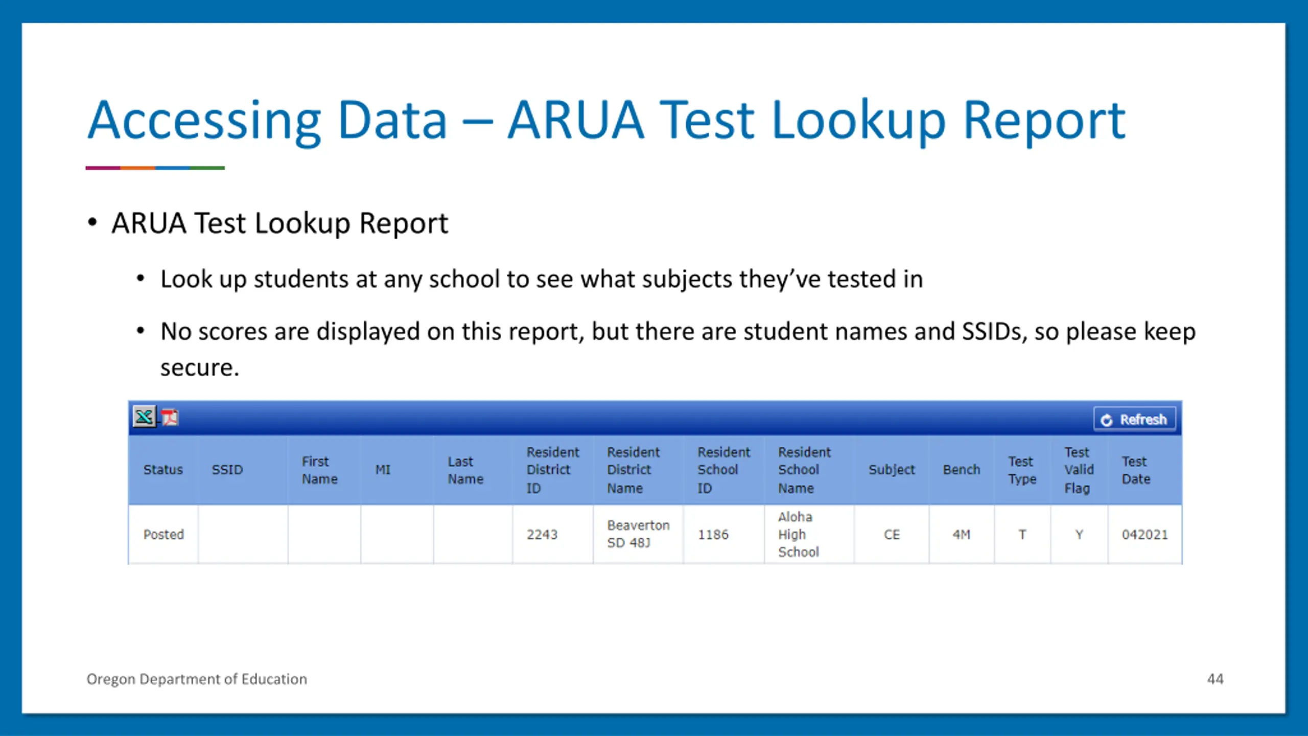 Accessing Data ARUA Test Lookup Report ARUA Test Lookup Report Look up students at any school to see what subjects they ve tested in No scores are displayed on this report, but there are student names and SSIDs, so please keep secure. Oregon Department of Education 44