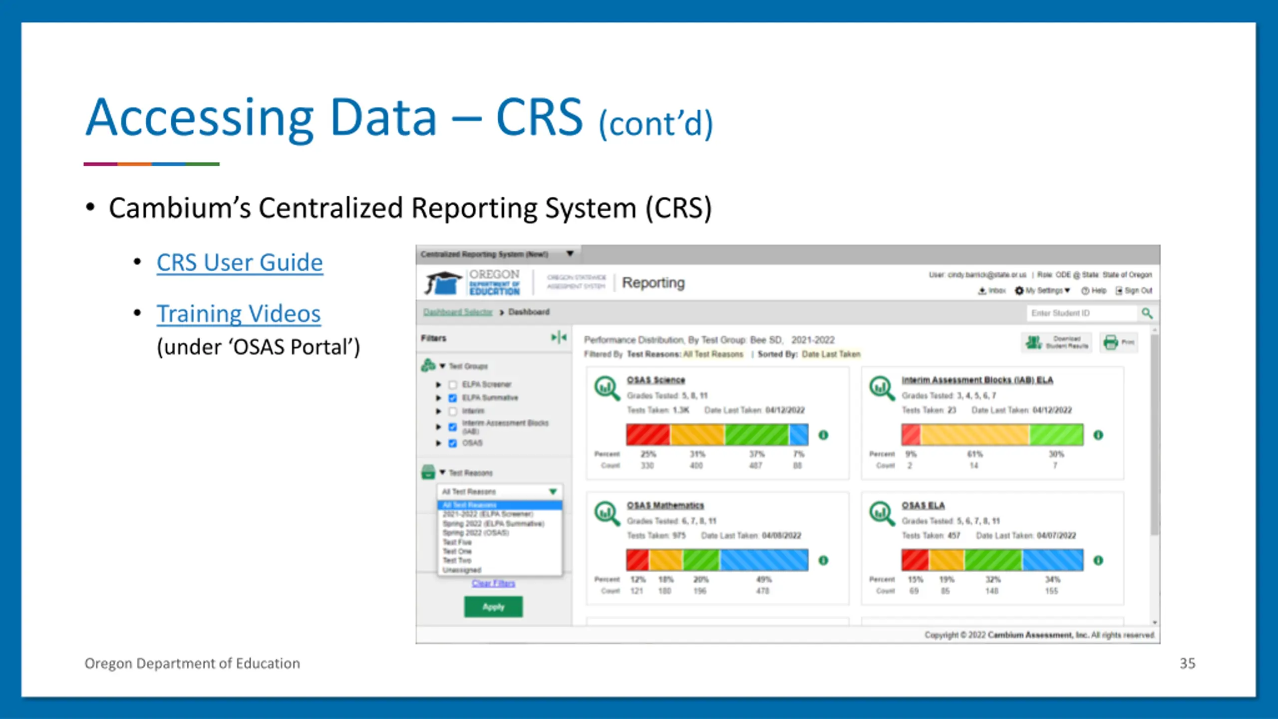 Accessing Data CRS (contd) Cambium s Centralized Reporting System (CRS) CRS User Guide Training Videos (under OSAS Portal ) Oregon Department of Education 35