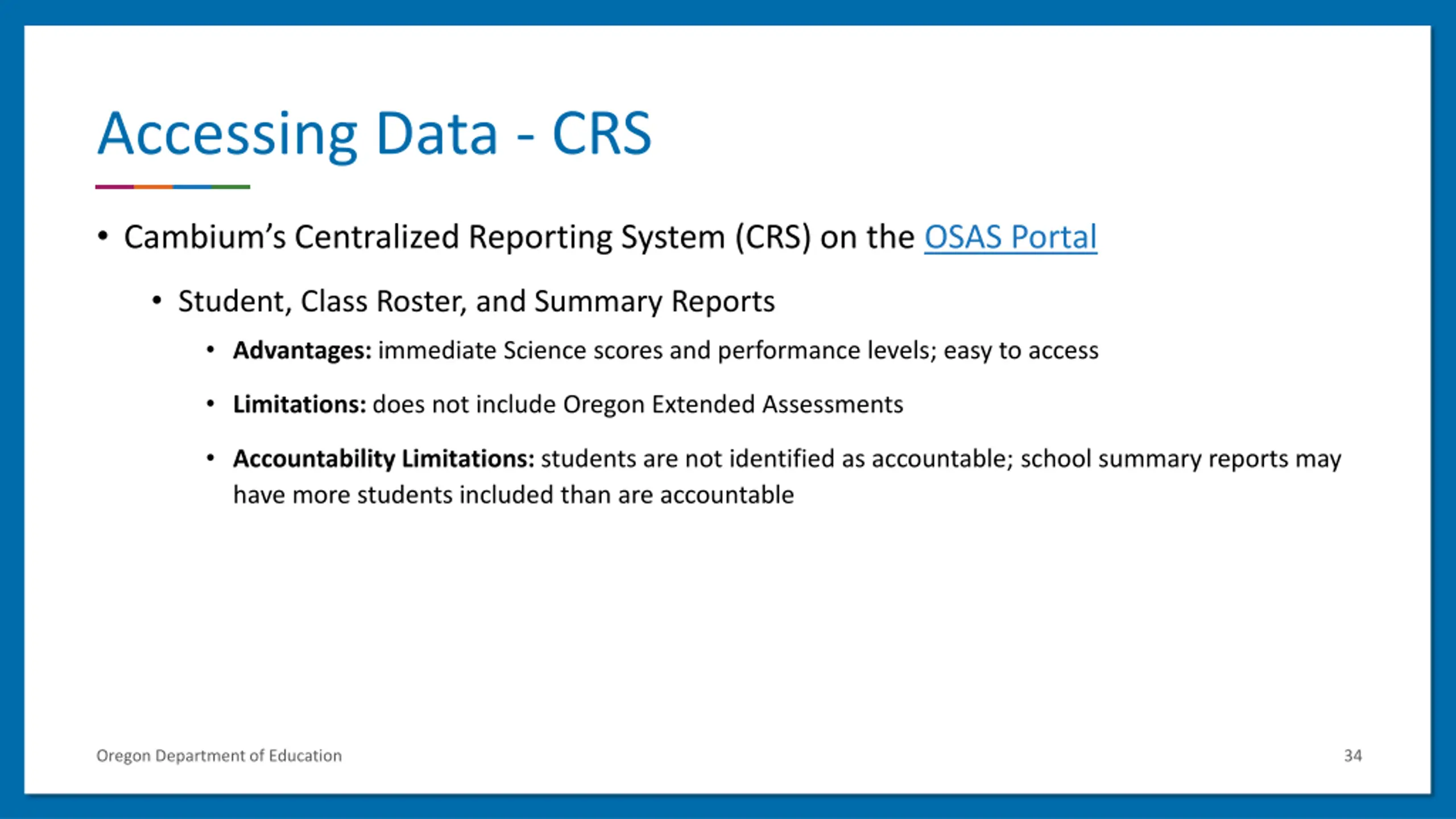 Accessing Data - TIDE Cambium s Test Information Distribution Engine (TIDE) on the OSAS Portal Participation Reports Advantages: immediate status reports of tests in progress and completed Limitations: does not include Oregon Extended Assessments Accountability Limitations: students are not identified as accountable; school summary reports may have more students included than are accountable Oregon Department of Education 33