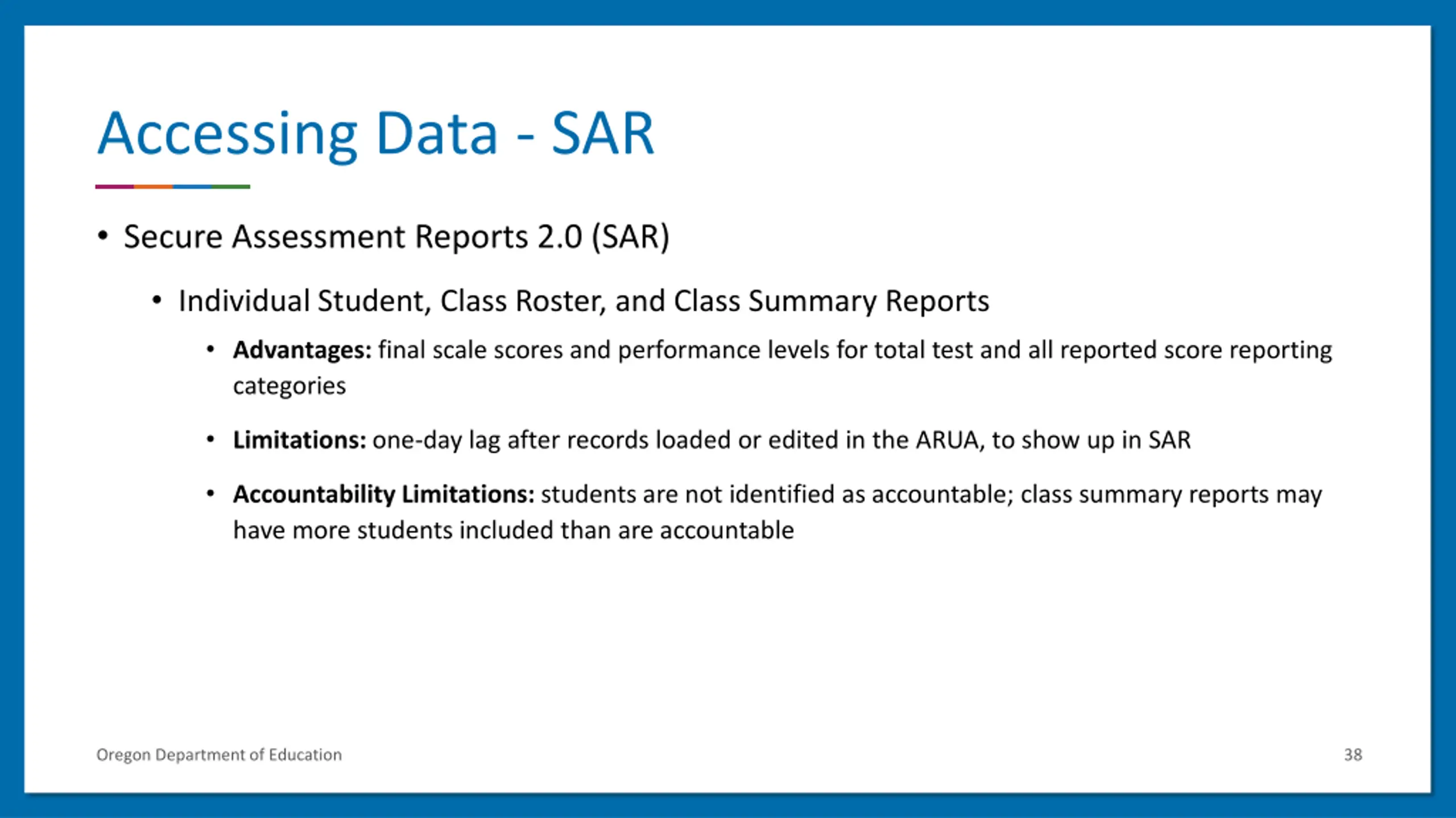 Accessing Data - SAR Secure Assessment Reports 2.0 (SAR) Individual Student, Class Roster, and Class Summary Reports Advantages: final scale scores and performance levels for total test and all reported score reporting categories Limitations: one-day lag after records loaded or edited in the ARUA, to show up in SAR Accountability Limitations: students are not identified as accountable; class summary reports may have more students included than are accountable Oregon Department of Education 38