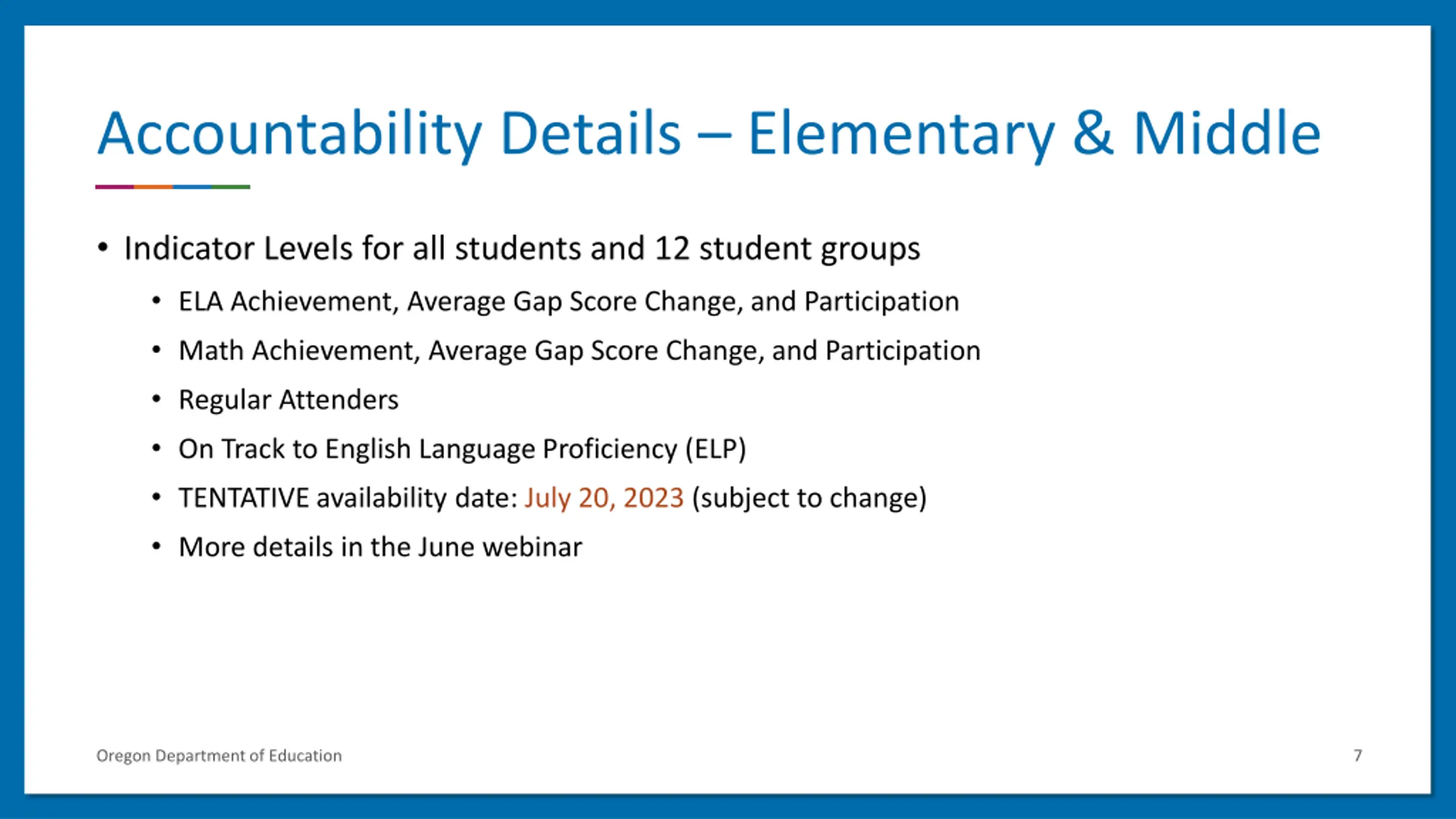 Accountability Details Elementary & Middle Indicator Levels for all students and 12 student groups ELA Achievement, Average Gap Score Change, and Participation Math Achievement, Average Gap Score Change, and Participation Regular Attenders On Track to English Language Proficiency (ELP) TENTATIVE availability date: July 20, 2023 (subject to change) More details in the June webinar Oregon Department of Education 7
