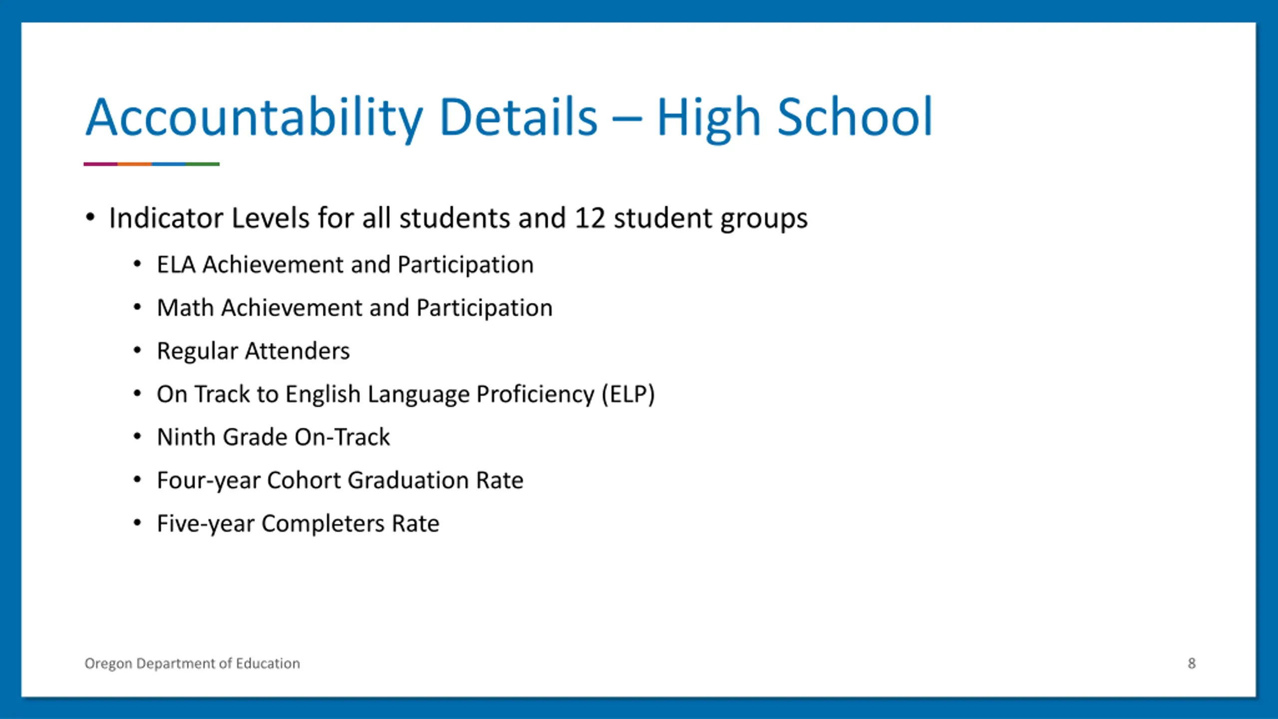 Accountability Details High School Indicator Levels for all students and 12 student groups ELA Achievement and Participation Math Achievement and Participation Regular Attenders On Track to English Language Proficiency (ELP) Ninth Grade On-Track Four-year Cohort Graduation Rate Five-year Completers Rate Oregon Department of Education 8