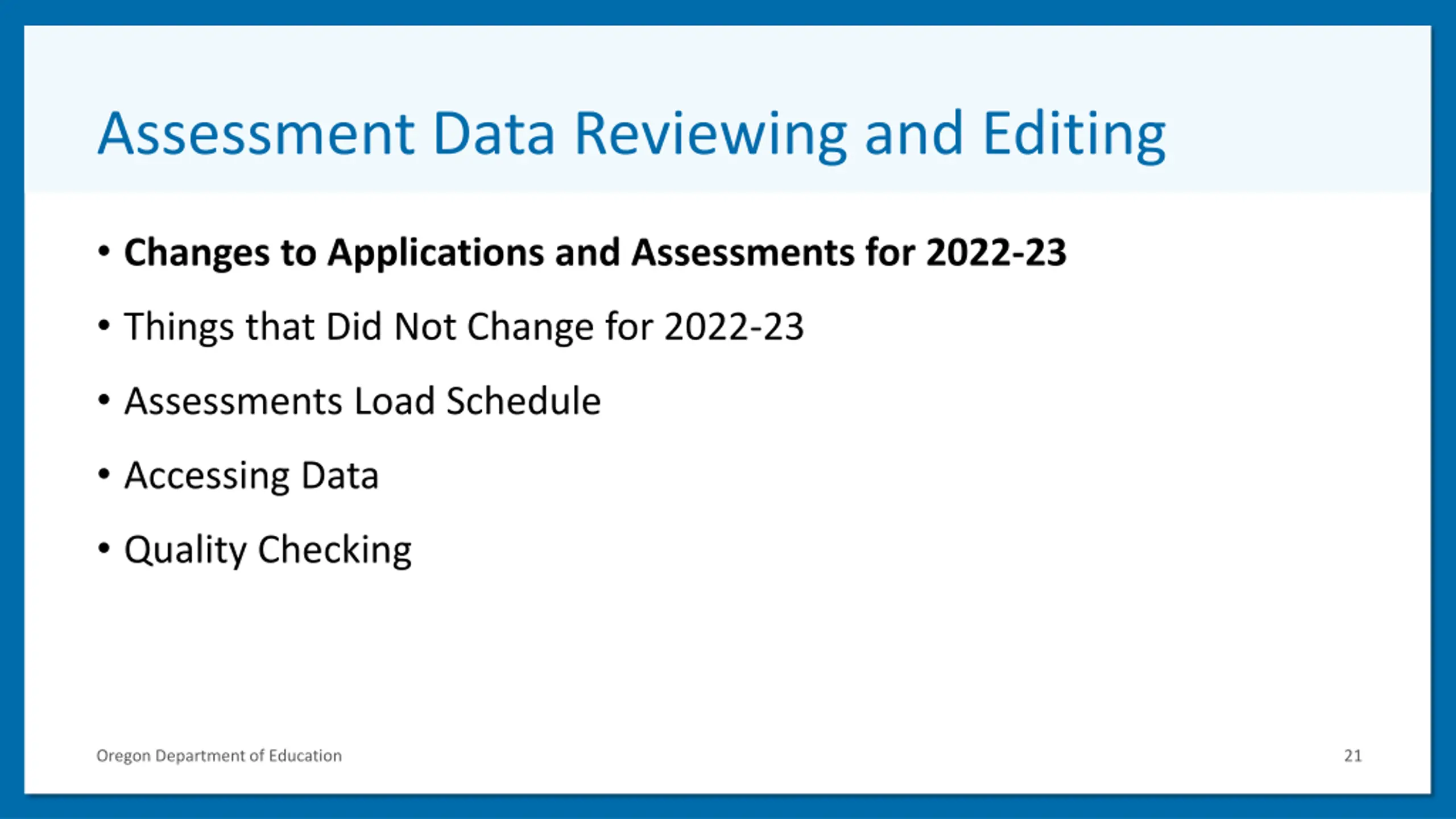 Assessment Data Reviewing and Editing 1 Changes to Applications and Assessments for 2022-23 Things that Did Not Change for 2022-23 Assessments Load Schedule Accessing Data Quality Checking Oregon Department of Education 21