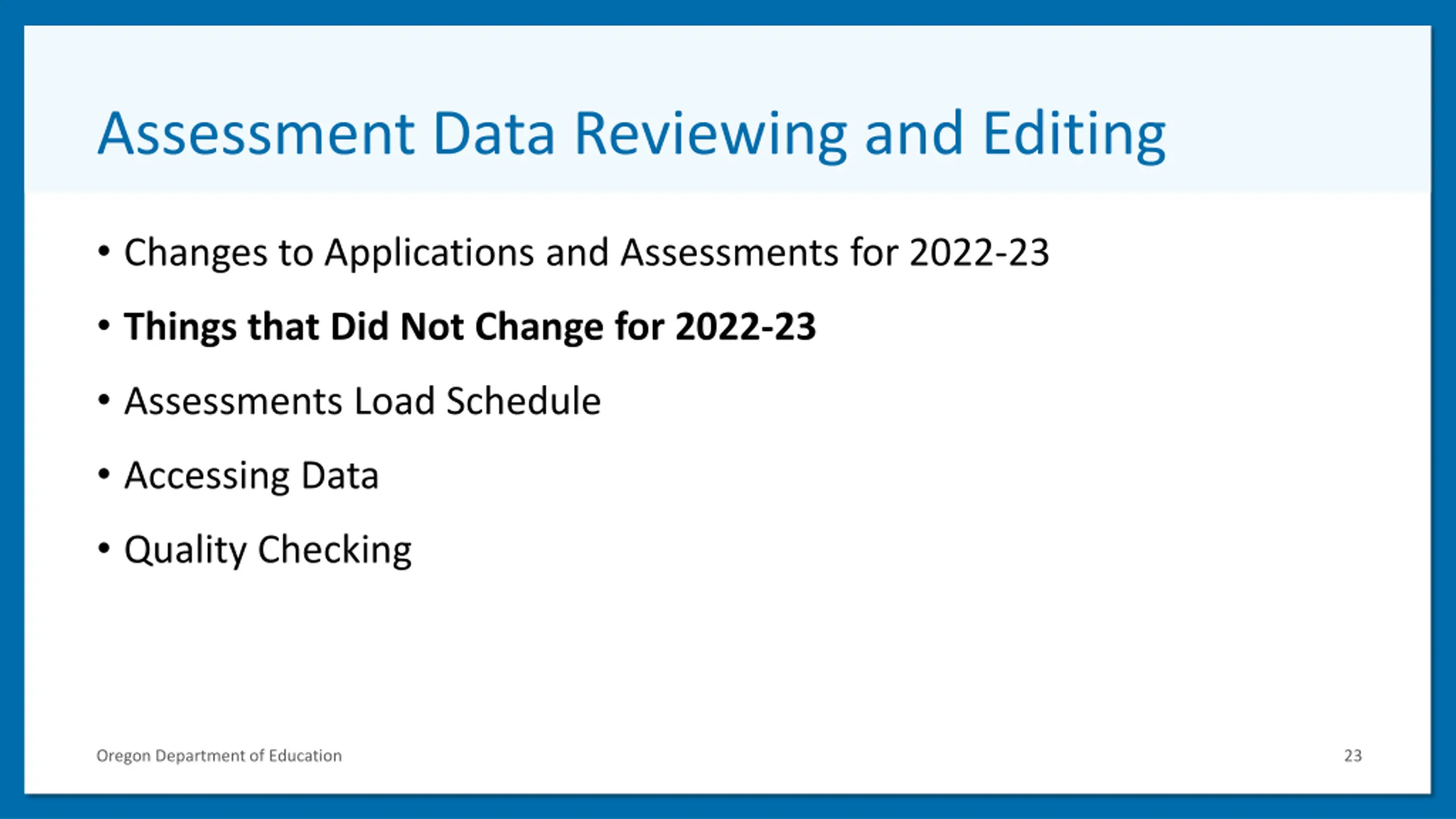 Assessment Data Reviewing and Editing 2 Changes to Applications and Assessments for 2022-23 Things that Did Not Change for 2022-23 Assessments Load Schedule Accessing Data Quality Checking Oregon Department of Education 23