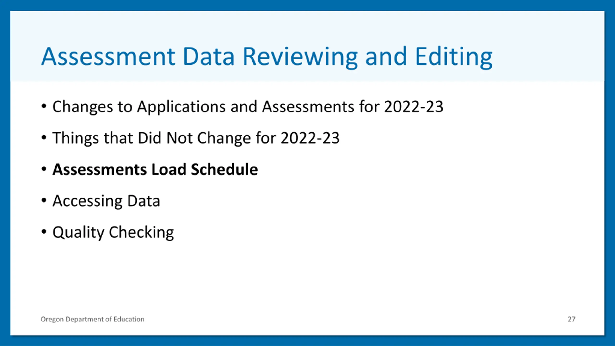 Assessment Data Reviewing and Editing 3 Changes to Applications and Assessments for 2022-23 Things that Did Not Change for 2022-23 Assessments Load Schedule Accessing Data Quality Checking Oregon Department of Education 27