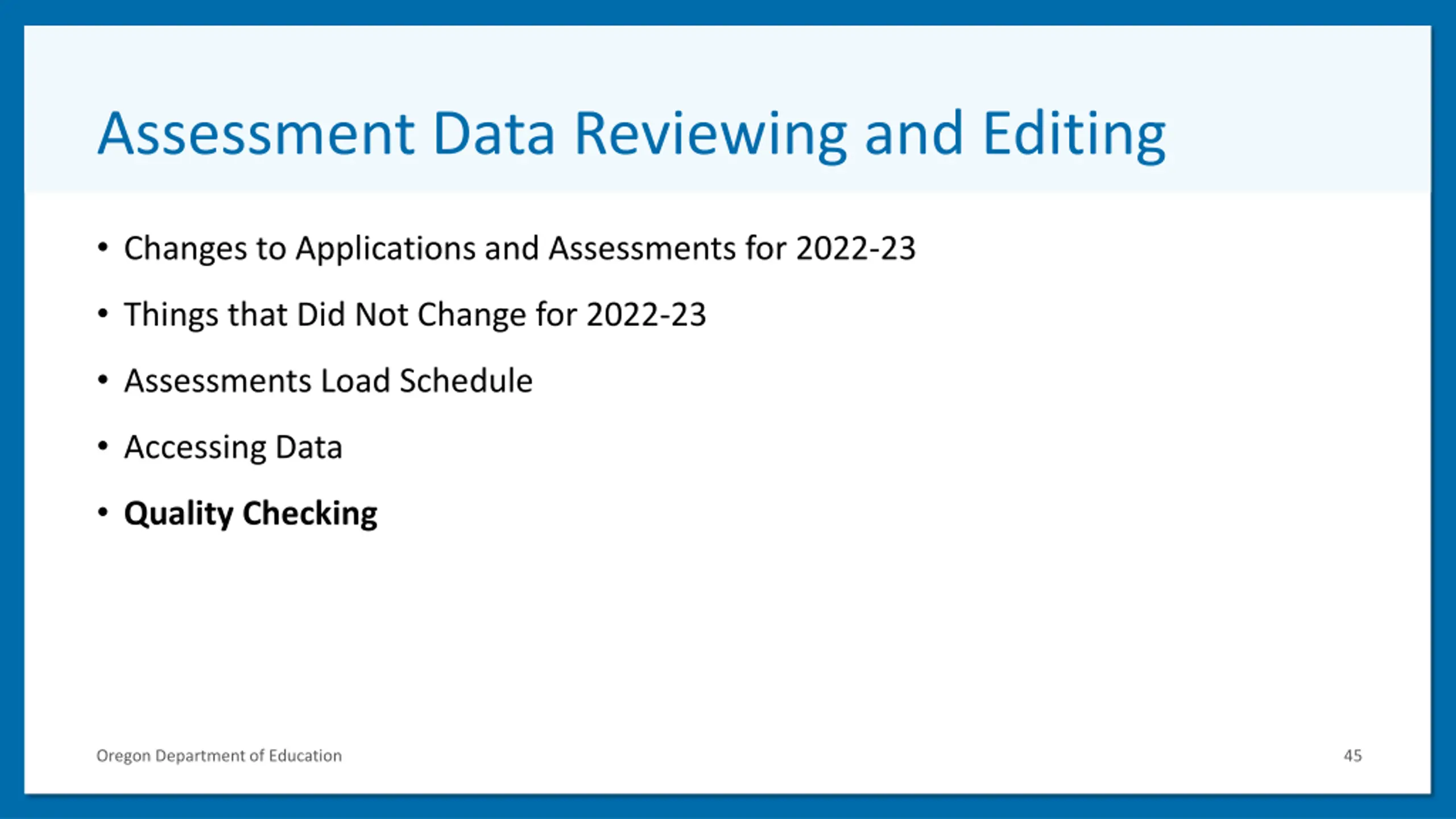 Assessment Data Reviewing and Editing 5 Changes to Applications and Assessments for 2022-23 Things that Did Not Change for 2022-23 Assessments Load Schedule Accessing Data Quality Checking Oregon Department of Education 45