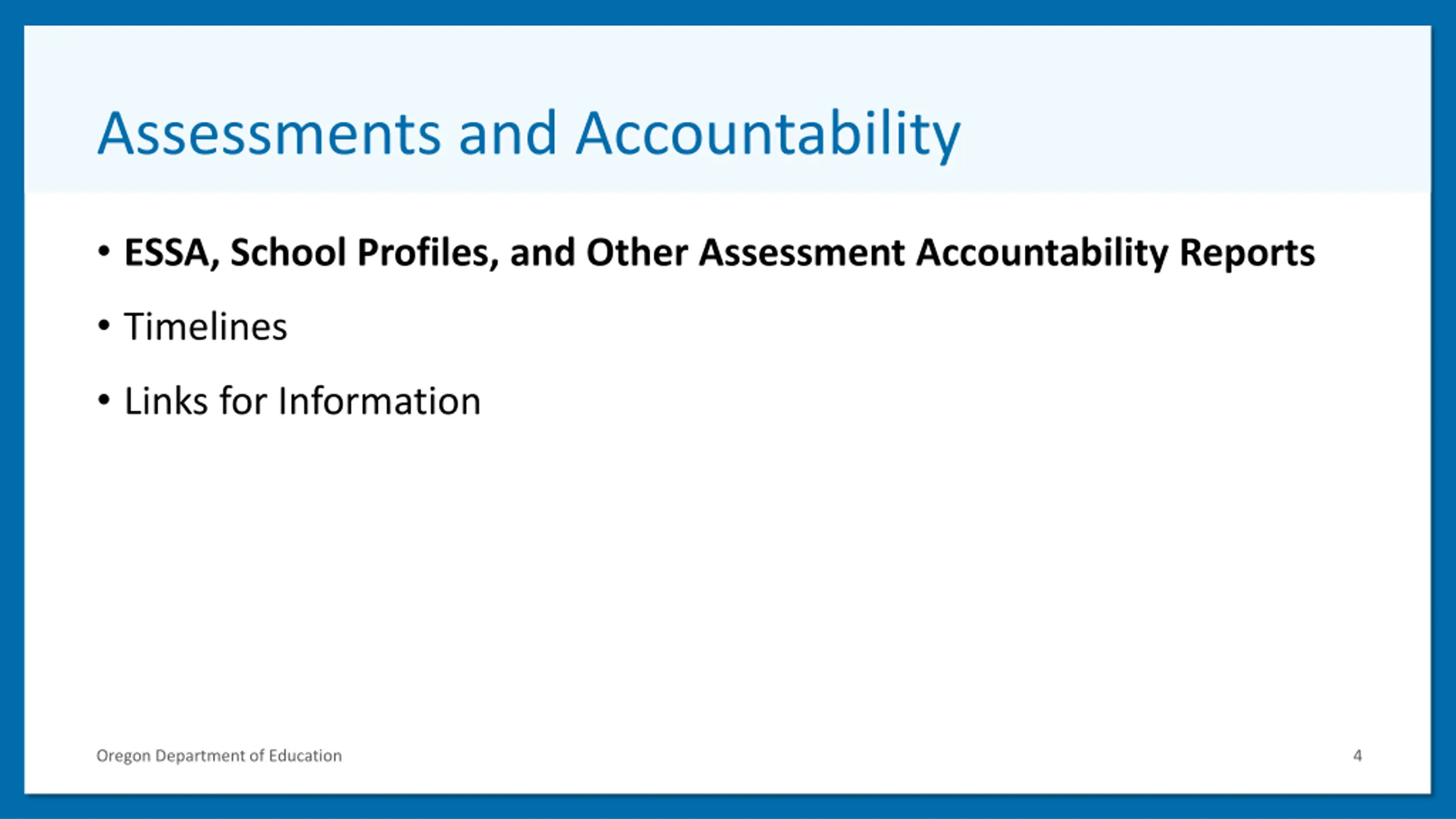 Assessments and Accountability 3 ESSA, School Profiles, and Other Assessment Accountability Reports Timelines Links for Information Oregon Department of Education 16