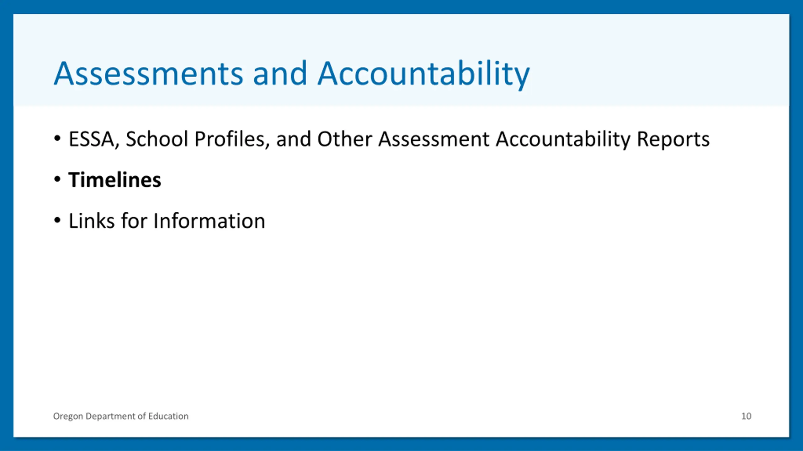 Assessments and Accountability 2 ESSA, School Profiles, and Other Assessment Accountability Reports Timelines Links for Information Oregon Department of Education 10