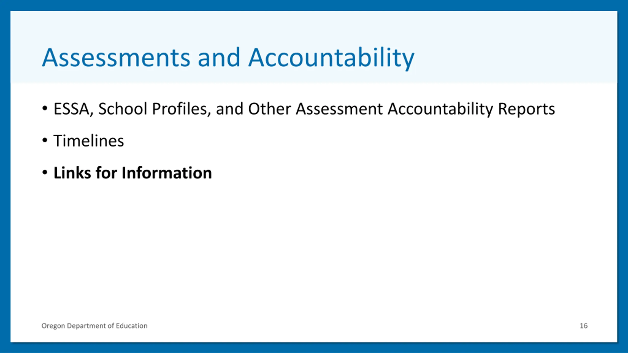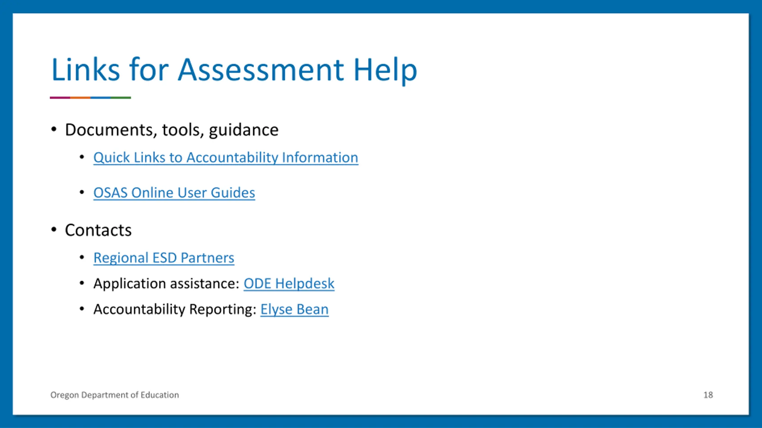 Links for Webpages Quick Links to Accountability Information Assessment & Accountability Checklist Every Student Succeeds Act (ESSA) Training (on the ODE District secure website) Oregon Department of Education 17