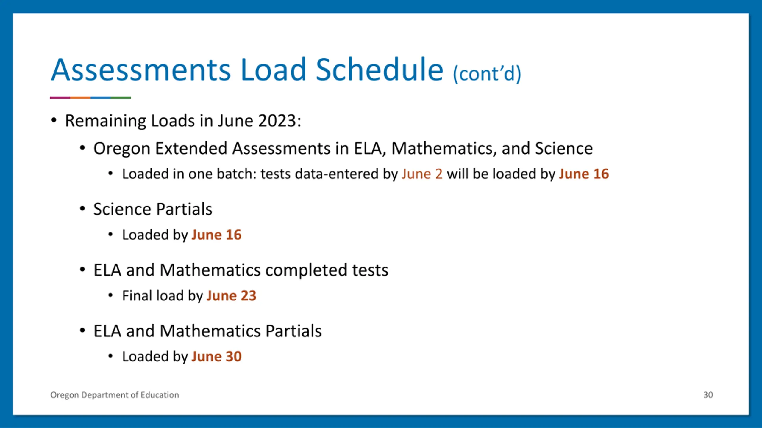 Assessments Load Schedule for 2022-23 (contd) By June 6 (reopening of the ARUA after second closure for processing): More ELA & Math tests completed through mid-May All ELPA Summative REMOTE tests loaded by June 2 Science tests completed by June 1 (loaded on June 2) Non-Participation ( Virtual ) Records Initial load and available to districts on May 31 by 9 AM Refreshed and available weekly through summer (except week of July 4) Student Group Flags updated from Third Period Cumulative ADM & other student collections Same schedule as Virtual records Oregon Department of Education 29