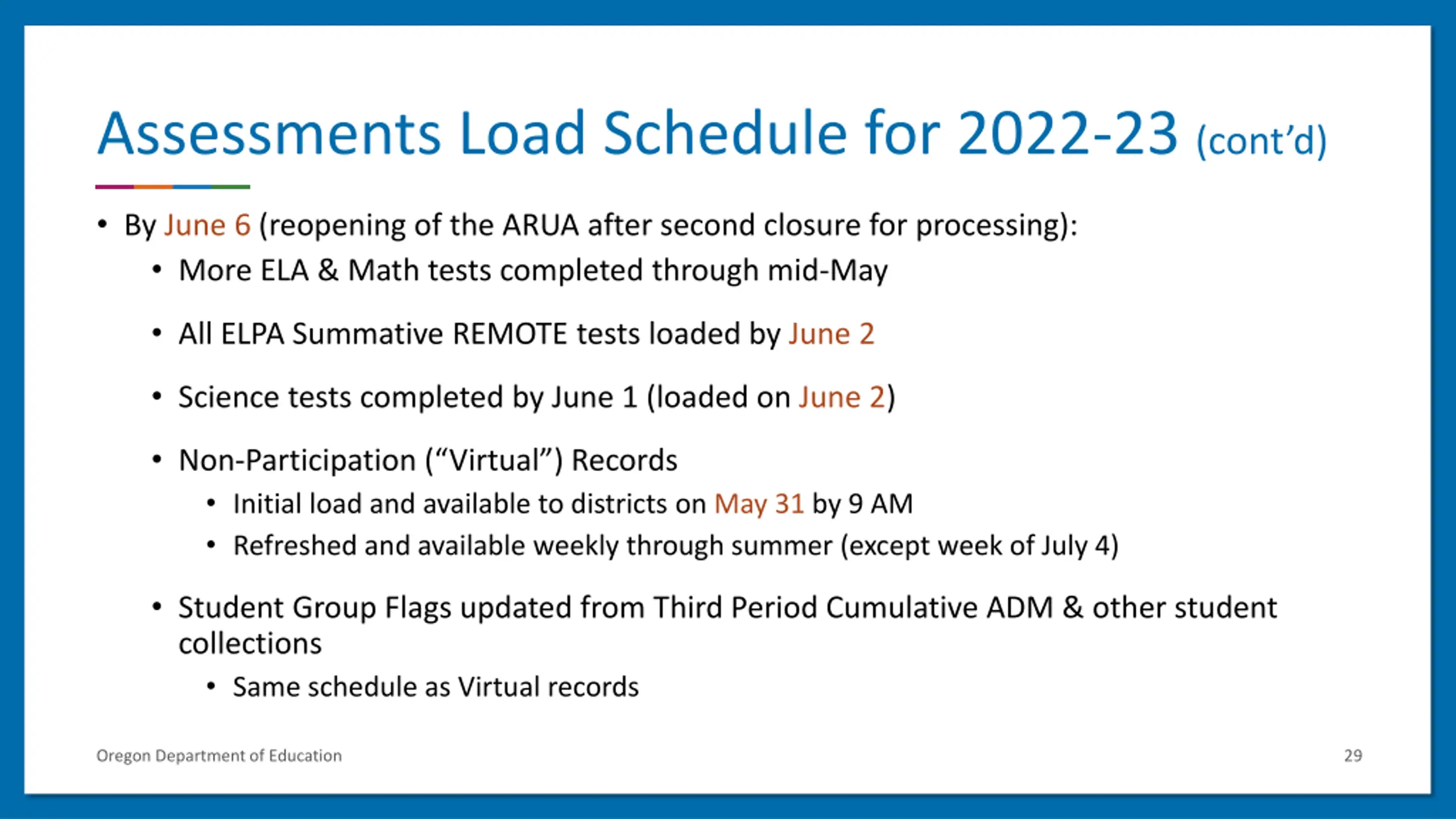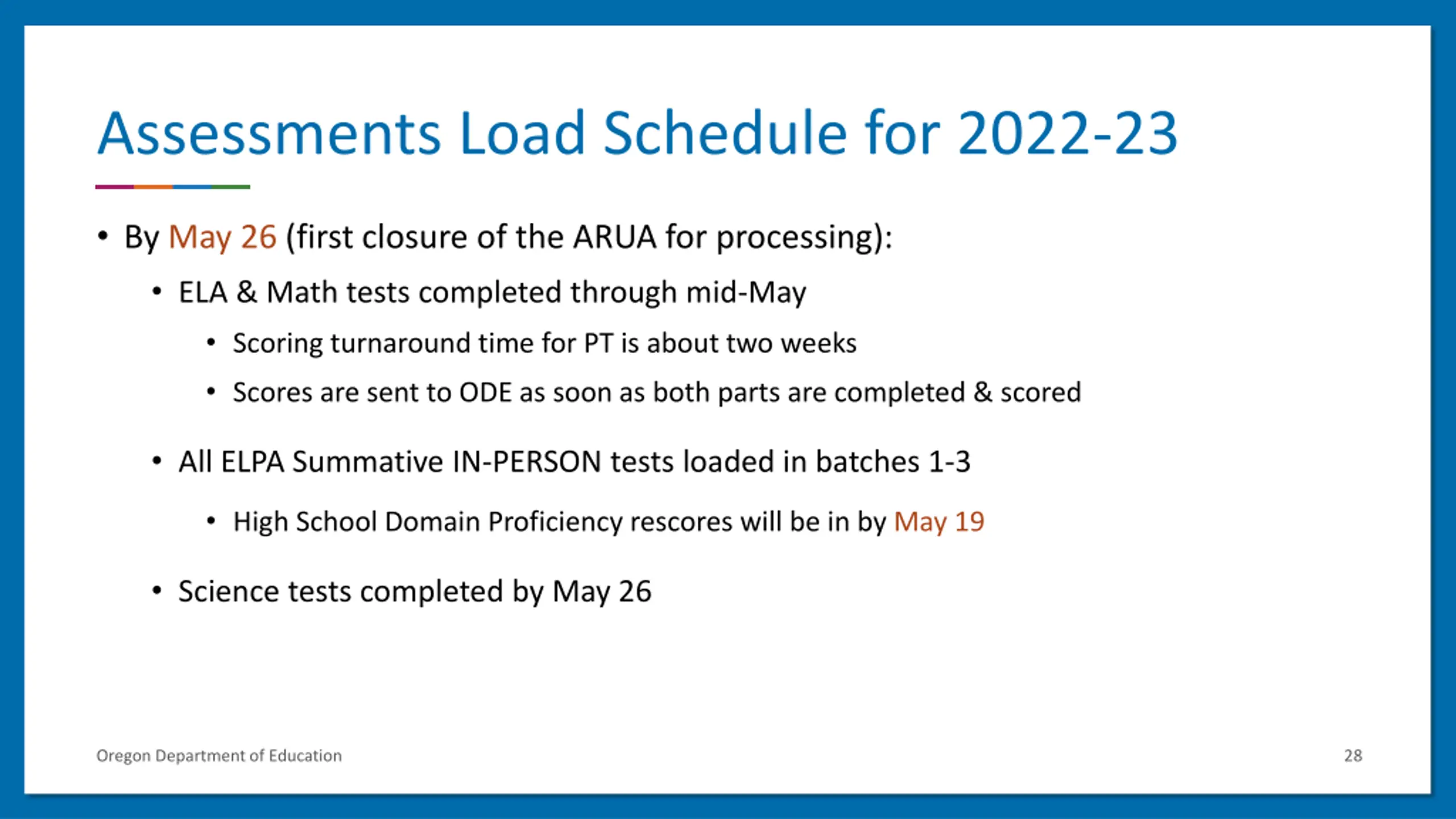 Assessments Load Schedule for 2022-23 By May 26 (first closure of the ARUA for processing): ELA & Math tests completed through mid-May Scoring turnaround time for PT is about two weeks Scores are sent to ODE as soon as both parts are completed & scored All ELPA Summative IN-PERSON tests loaded in batches 1-3 High School Domain Proficiency rescores will be in by May 19 Science tests completed by May 26 Oregon Department of Education 28