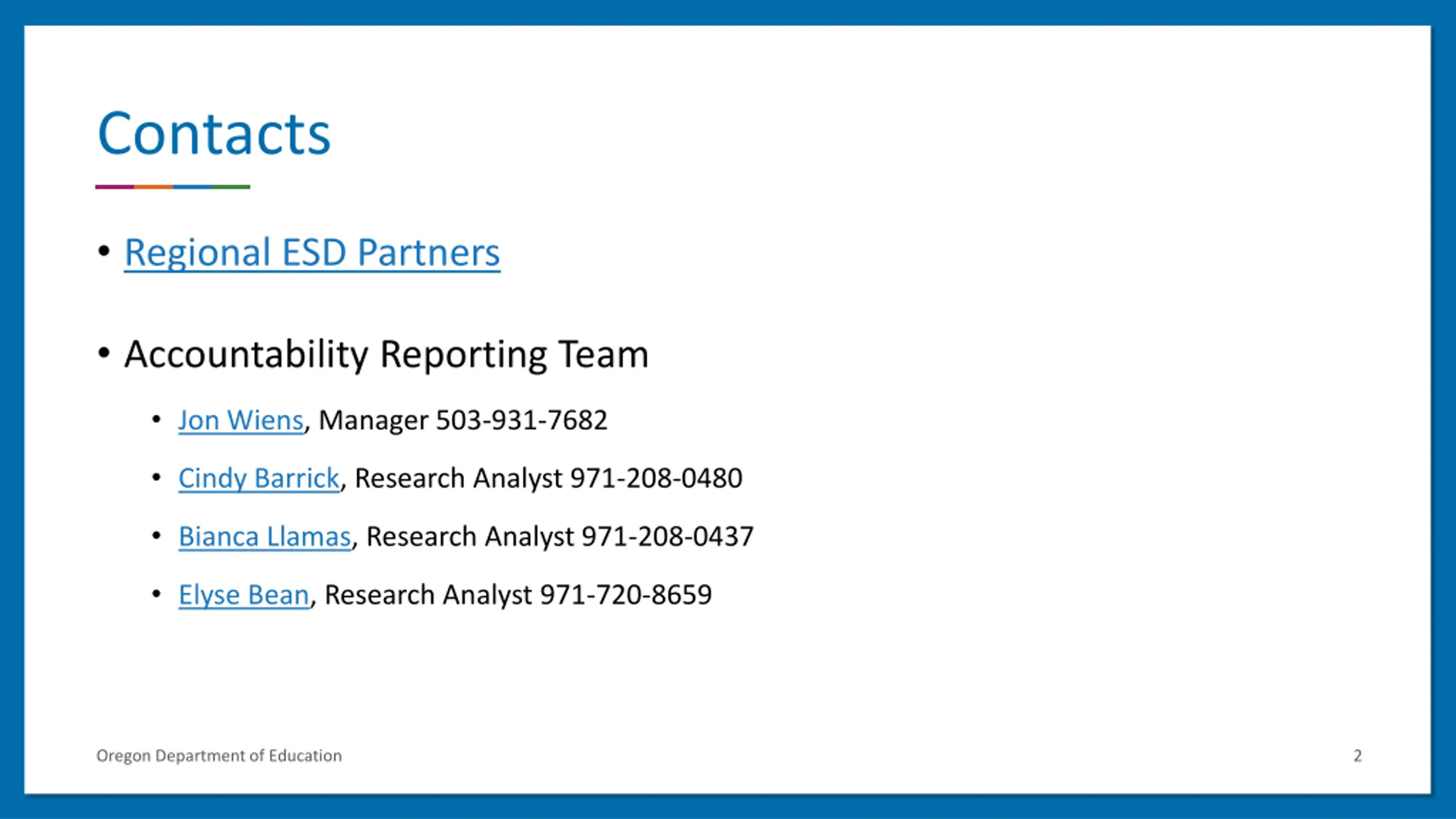 Contacts Regional ESD Partners Accountability Reporting Team Jon Wiens, Manager 503-931-7682 Cindy Barrick, Research Analyst 971-208-0480 Bianca Llamas, Research Analyst 971-208-0437 Elyse Bean, Research Analyst 971-720-8659 Oregon Department of Education 2