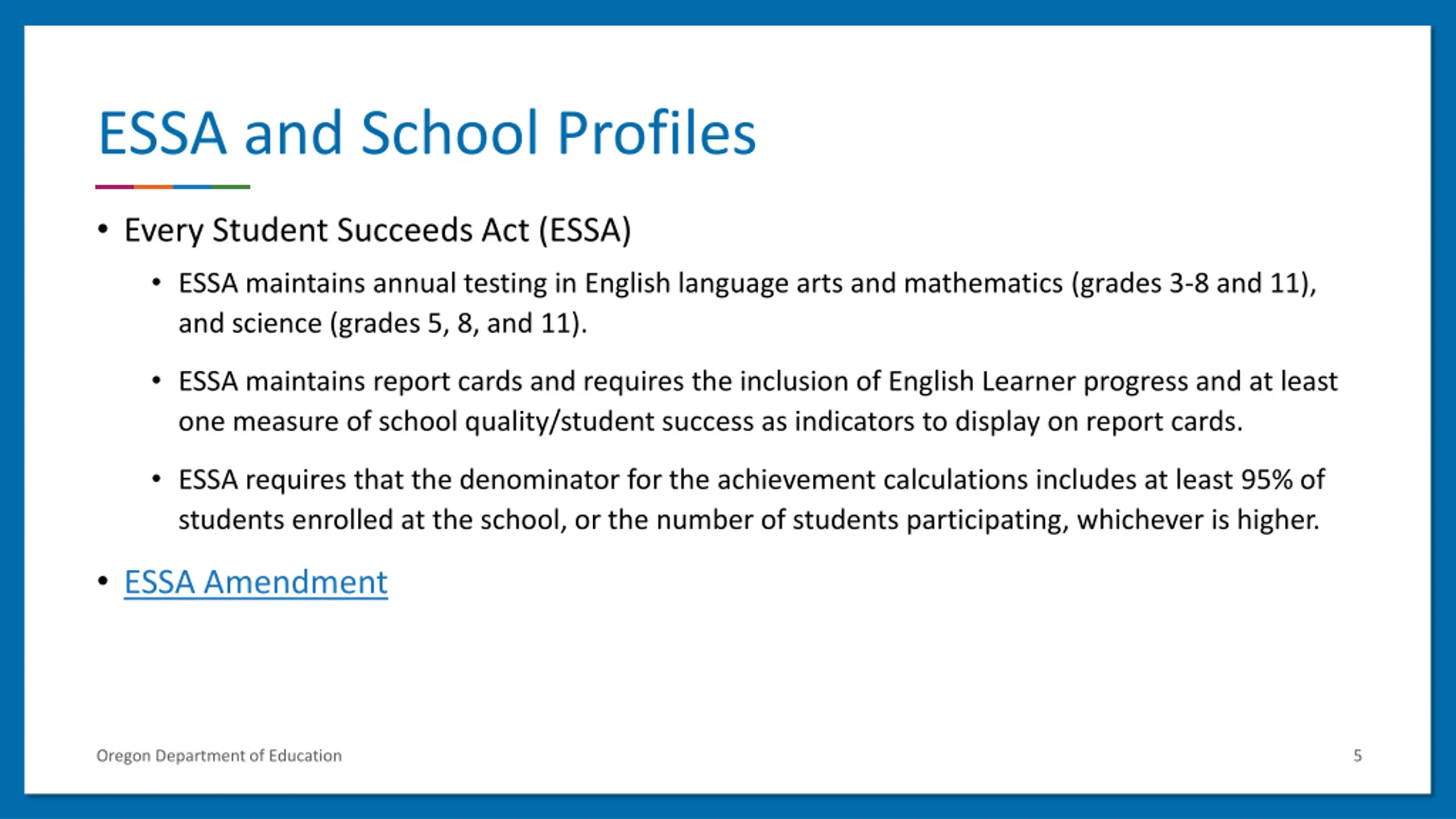 ESSA and School Profiles Every Student Succeeds Act (ESSA) ESSA maintains annual testing in English language arts and mathematics (grades 3-8 and 11), and science (grades 5, 8, and 11). ESSA maintains report cards and requires the inclusion of English Learner progress and at least one measure of school quality/student success as indicators to display on report cards. ESSA requires that the denominator for the achievement calculations includes at least 95% of students enrolled at the school, or the number of students participating, whichever is higher. ESSA Amendment Oregon Department of Education 5