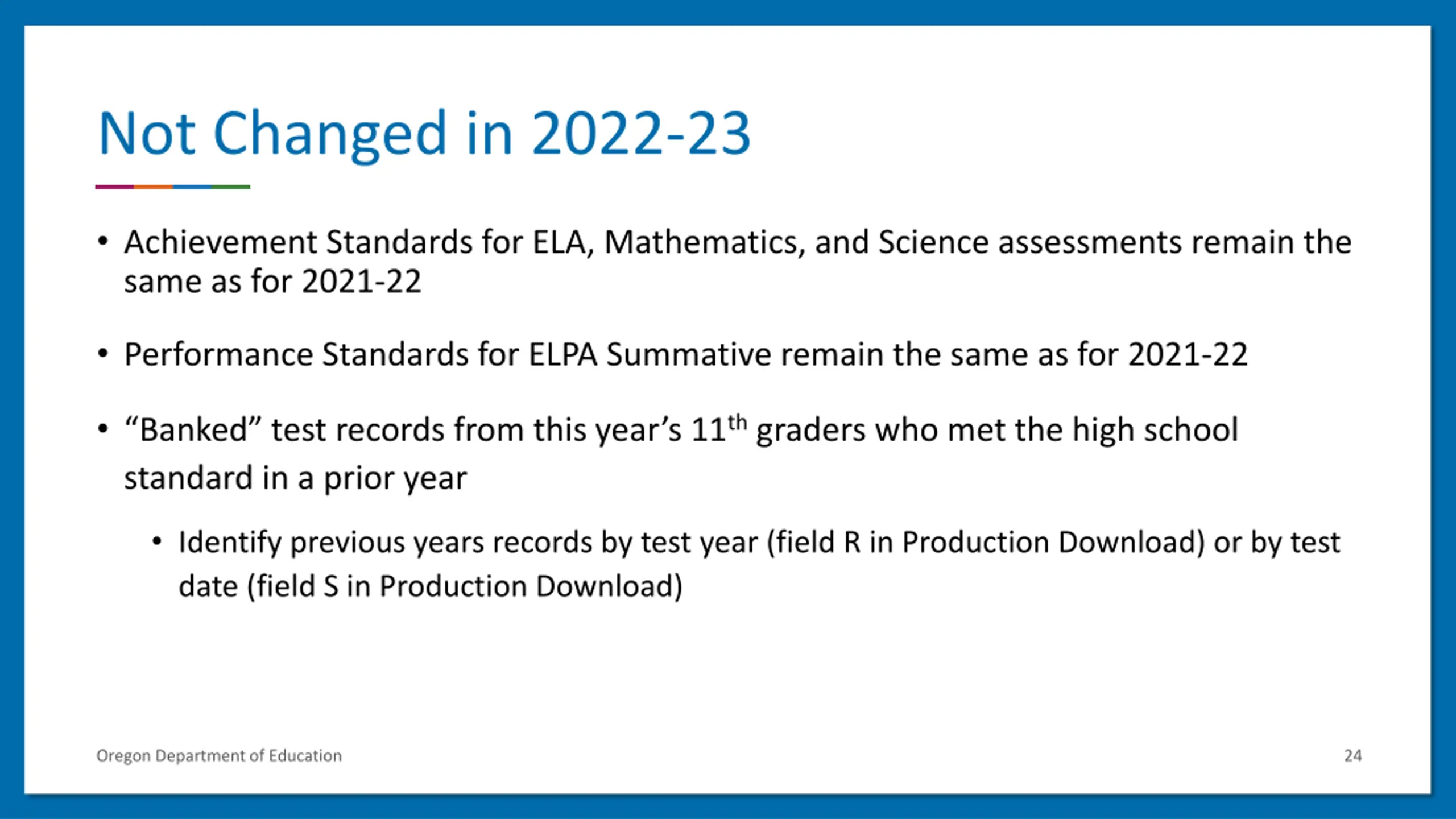 Not Changed in 2022-23 Achievement Standards for ELA, Mathematics, and Science assessments remain the same as for 2021-22 Performance Standards for ELPA Summative remain the same as for 2021-22 Banked test records from this year s 11th graders who met the high school standard in a prior year Identify previous years records by test year (field R in Production Download) or by test date (field S in Production Download) Oregon Department of Education 24