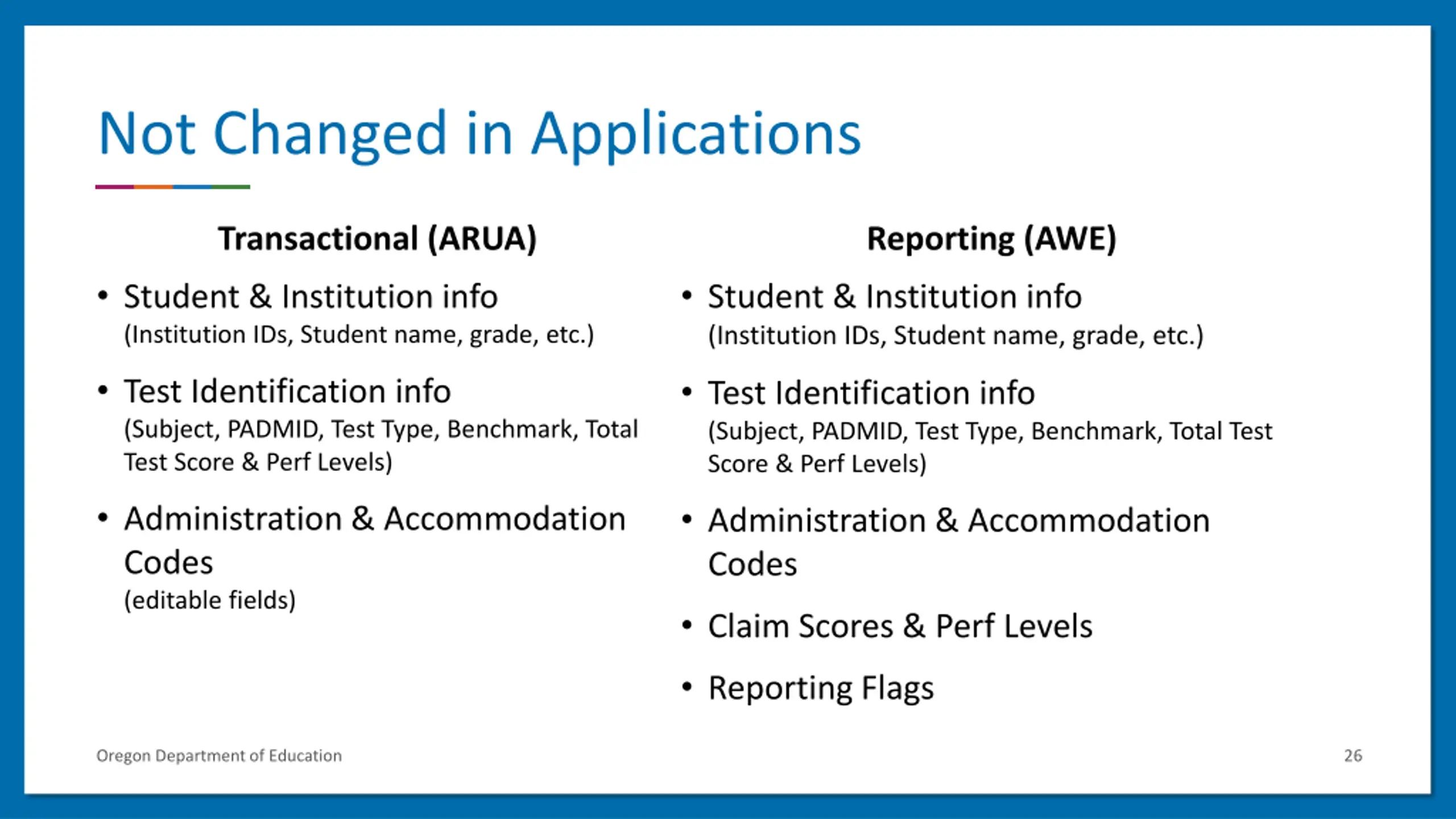 Not Changed in Applications Transactional (ARUA) Student & Institution info (Institution IDs, Student name, grade, etc.) Reporting (AWE) Student & Institution info (Institution IDs, Student name, grade, etc.) Test Identification info (Subject, PADMID, Test Type, Benchmark, Total Test Score & Perf Levels) Test Identification info (Subject, PADMID, Test Type, Benchmark, Total Test Score & Perf Levels) Administration & Accommodation Codes (editable fields) Administration & Accommodation Codes Claim Scores & Perf Levels Reporting Flags Oregon Department of Education 26