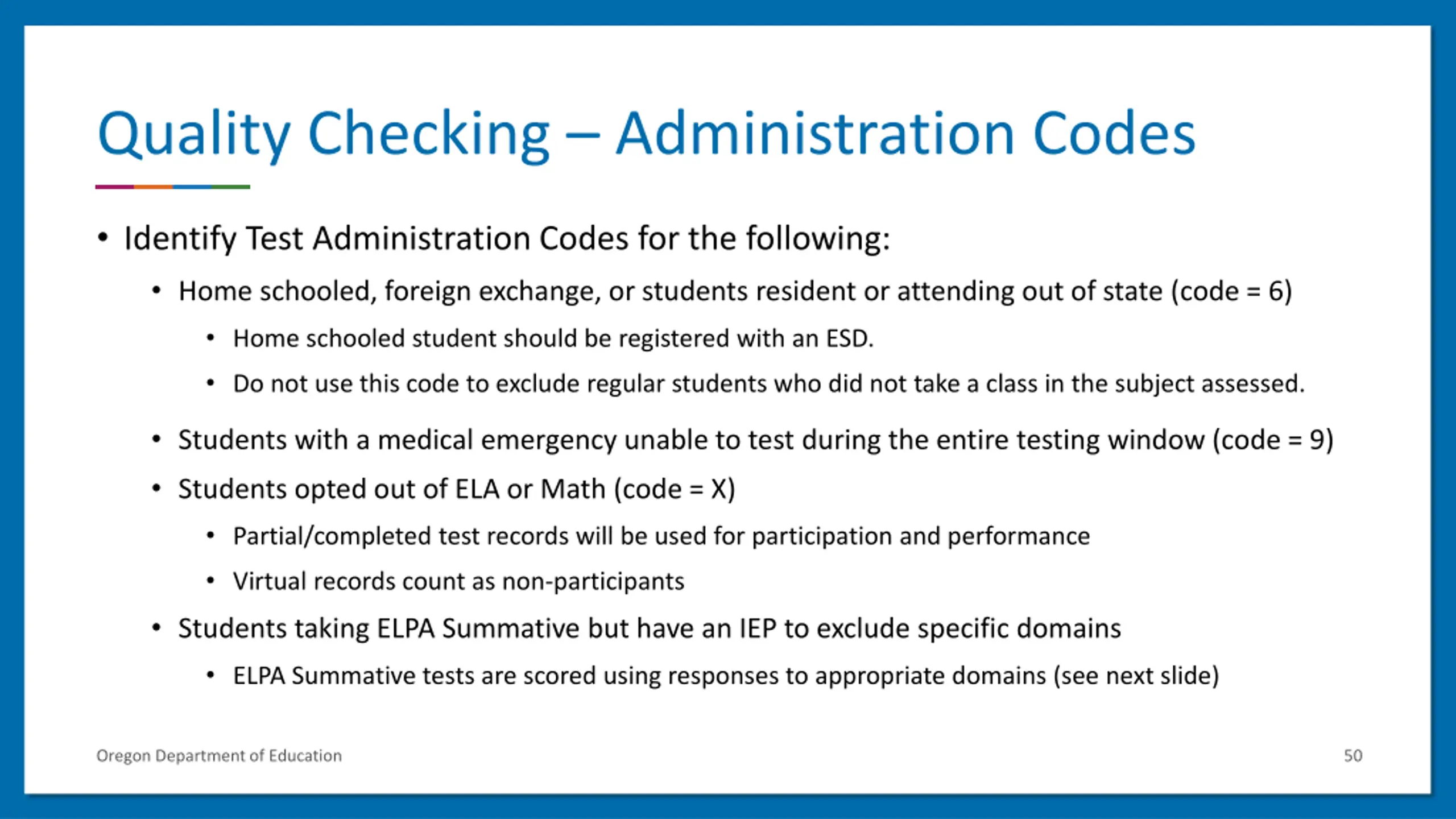 Quality Checking Administration Codes Identify Test Administration Codes for the following: Home schooled, foreign exchange, or students resident or attending out of state (code = 6) Home schooled student should be registered with an ESD. Do not use this code to exclude regular students who did not take a class in the subject assessed. Students with a medical emergency unable to test during the entire testing window (code = 9) Students opted out of ELA or Math (code = X) Partial/completed test records will be used for participation and performance Virtual records count as non-participants Students taking ELPA Summative but have an IEP to exclude specific domains ELPA Summative tests are scored using responses to appropriate domains (see next slide) Oregon Department of Education 50