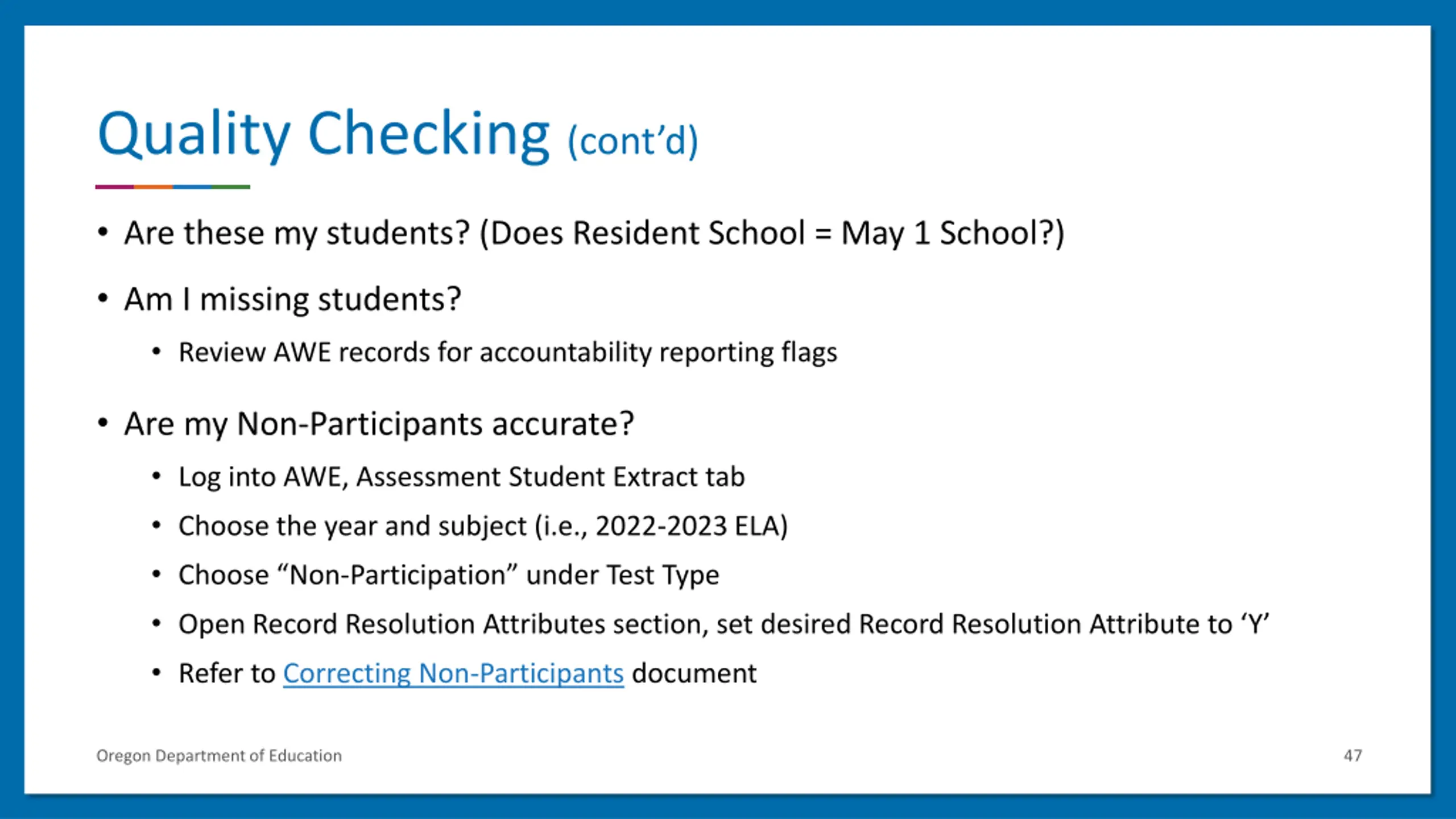 Quality Checking (contd) Are these my students? (Does Resident School = May 1 School?) Am I missing students? Review AWE records for accountability reporting flags Are my Non-Participants accurate? Log into AWE, Assessment Student Extract tab Choose the year and subject (i.e., 2022-2023 ELA) Choose Non-Participation under Test Type Open Record Resolution Attributes section, set desired Record Resolution Attribute to Y Refer to Correcting Non-Participants document Oregon Department of Education 47