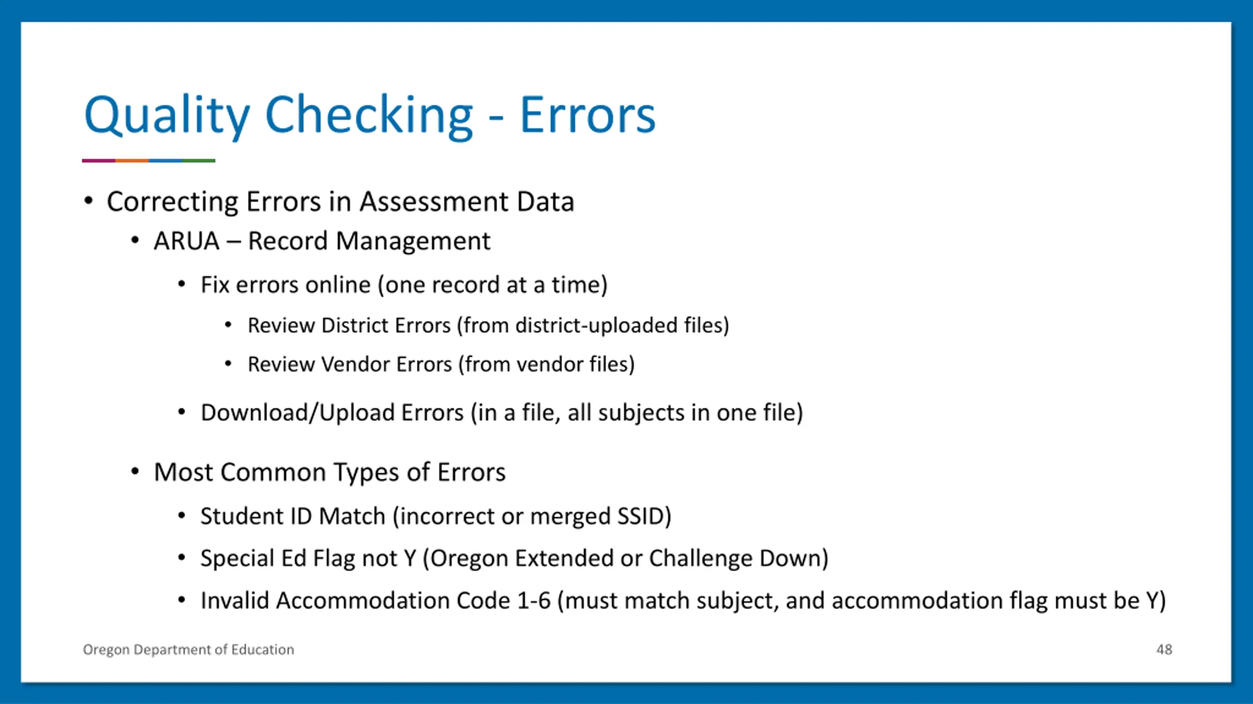 Quality Checking - Errors Correcting Errors in Assessment Data ARUA Record Management Fix errors online (one record at a time) Review District Errors (from district-uploaded files) Review Vendor Errors (from vendor files) Download/Upload Errors (in a file, all subjects in one file) Most Common Types of Errors Student ID Match (incorrect or merged SSID) Special Ed Flag not Y (Oregon Extended or Challenge Down) Invalid Accommodation Code 1-6 (must match subject, and accommodation flag must be Y) Oregon Department of Education 48
