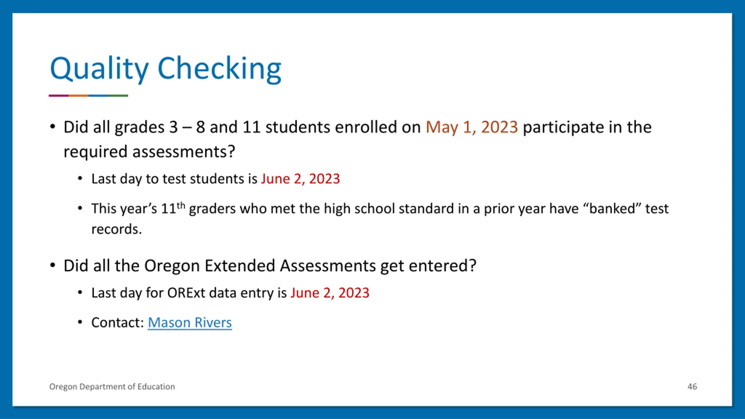Quality Checking Did all grades 3 8 and 11 students enrolled on May 1, 2023 participate in the required assessments? Last day to test students is June 2, 2023 This year s 11thgraders who met the high school standard in a prior year have banked test records. Did all the Oregon Extended Assessments get entered? Last day for ORExt data entry is June 2, 2023 Contact: Mason Rivers Oregon Department of Education 46