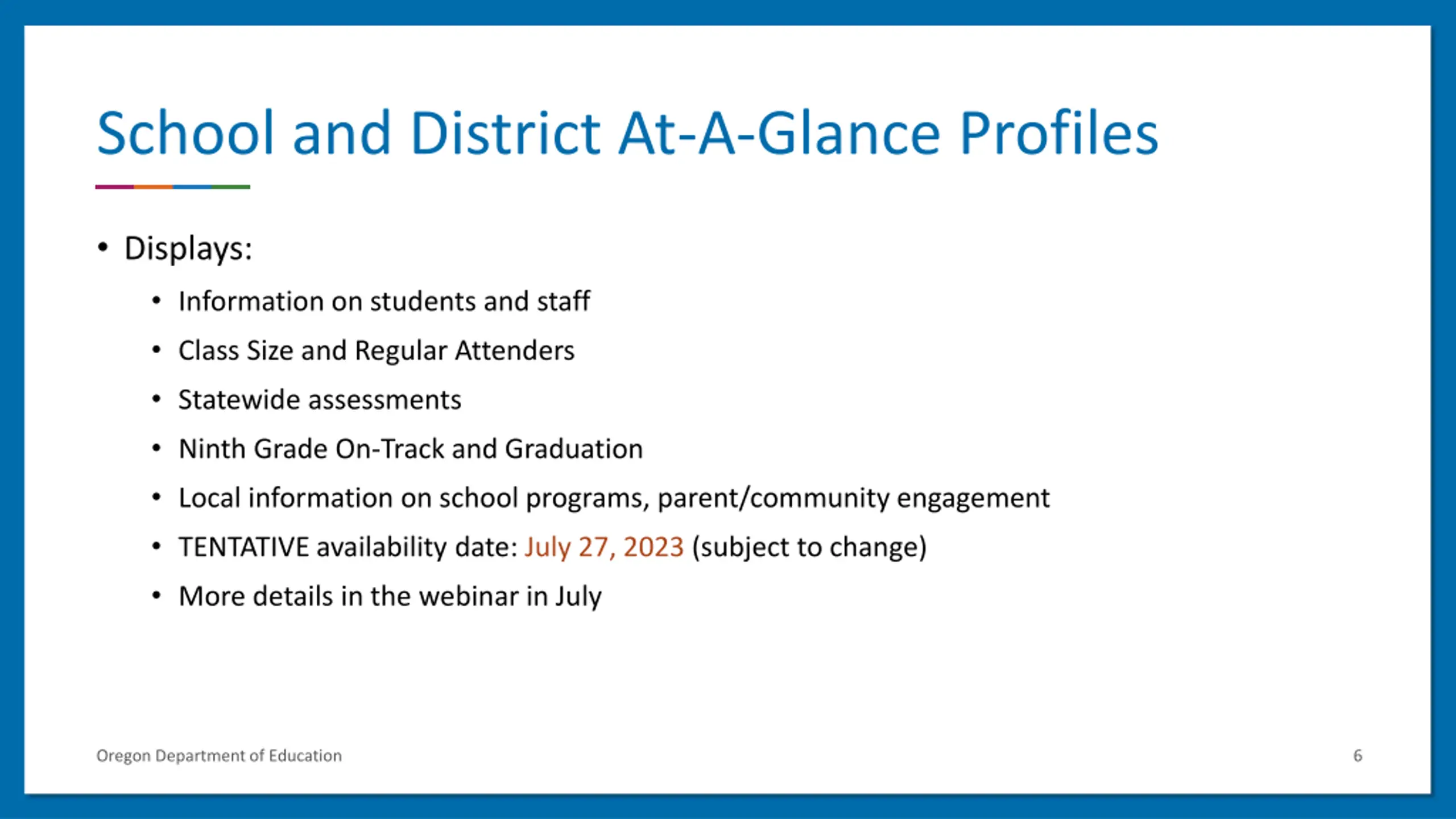 School and District At-A-Glance Profiles Displays: Information on students and staff Class Size and Regular Attenders Statewide assessments Ninth Grade On-Track and Graduation Local information on school programs, parent/community engagement TENTATIVE availability date: July 27, 2023 (subject to change) More details in the webinar in July Oregon Department of Education 6