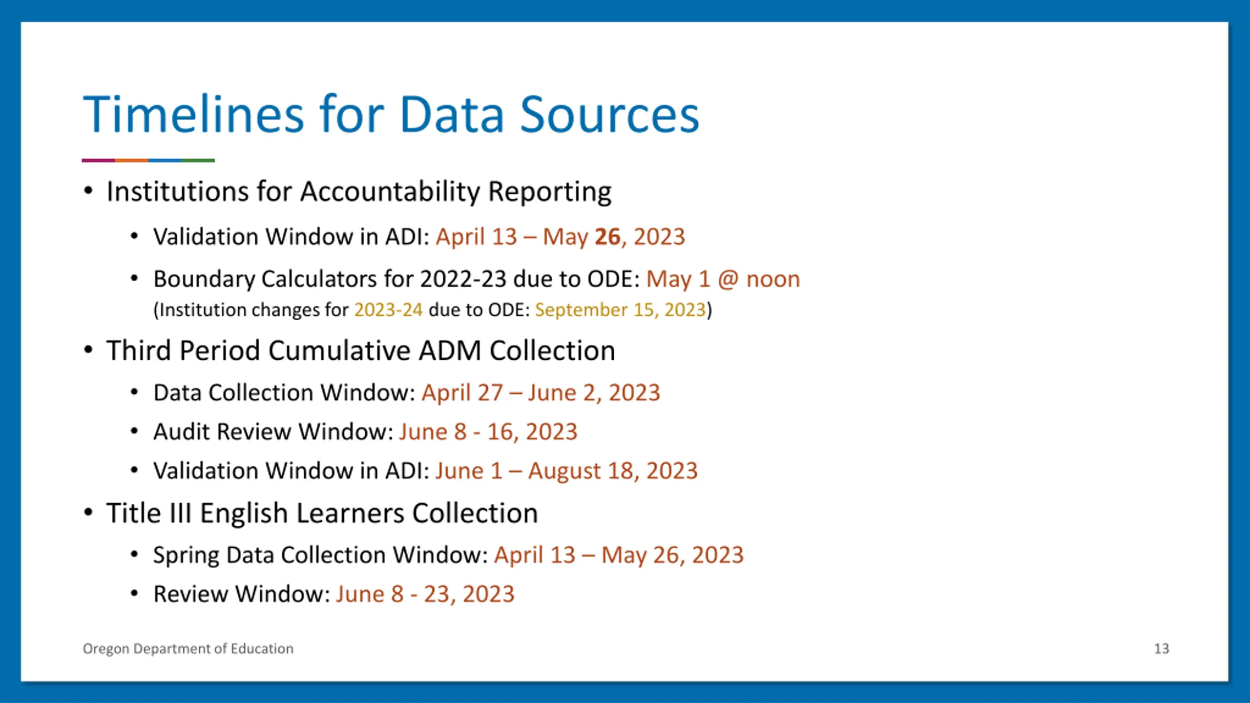 Timelines for Data Sources Institutions for Accountability Reporting Validation Window in ADI: April 13 May 26, 2023 Boundary Calculators for 2022-23 due to ODE: May 1 @ noon (Institution changes for 2023-24 due to ODE: September 15, 2023) Third Period Cumulative ADM Collection Data Collection Window: April 27 June 2, 2023 Audit Review Window: June 8 - 16, 2023 Validation Window in ADI: June 1 August 18, 2023 Title III English Learners Collection Spring Data Collection Window: April 13 May 26, 2023 Review Window: June 8 - 23, 2023 Oregon Department of Education 13
