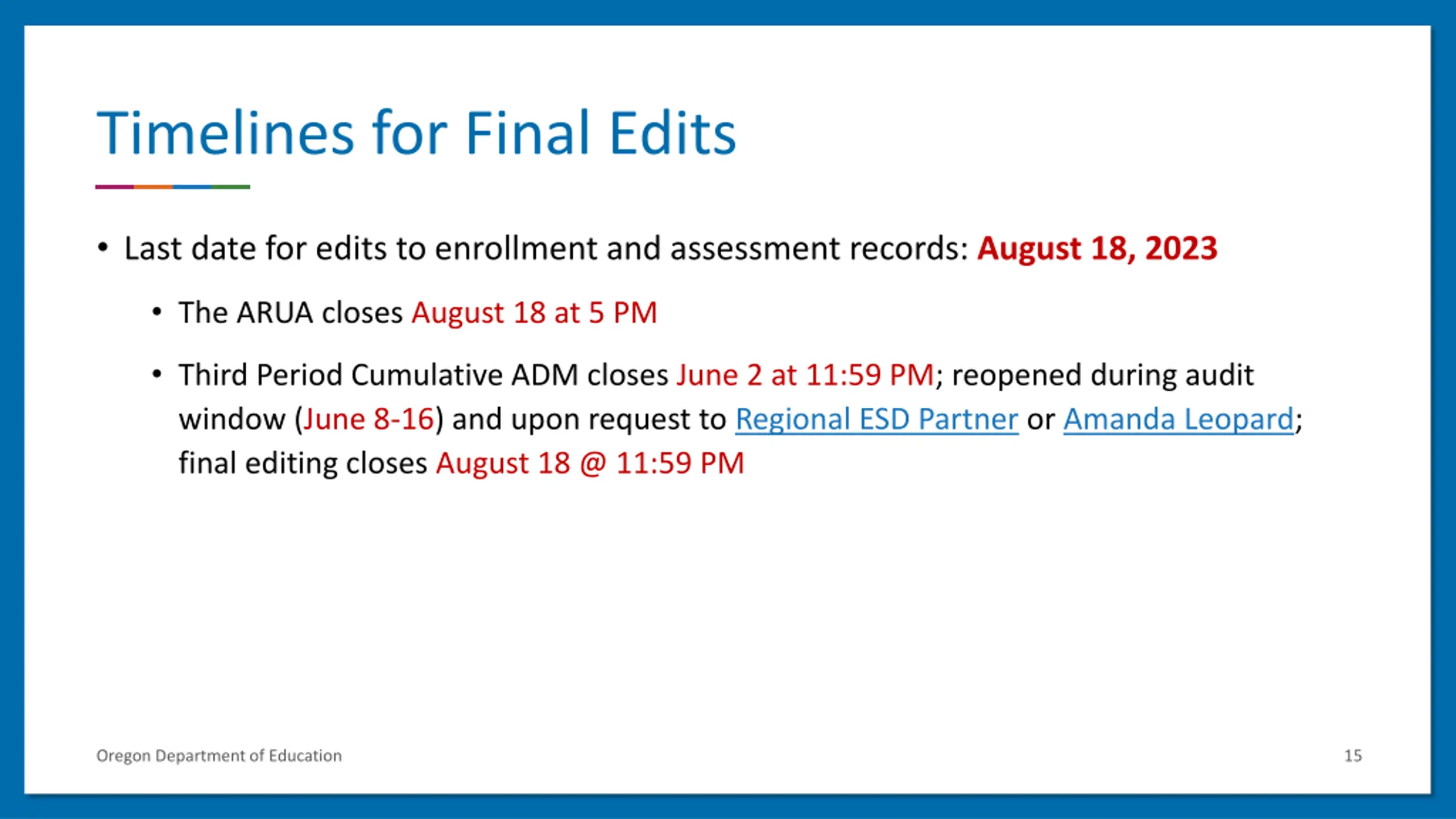 Timelines for Final Edits Last date for edits to enrollment and assessment records: August 18, 2023 The ARUA closes August 18 at 5 PM Third Period Cumulative ADM closes June 2 at 11:59 PM; reopened during audit window (June 8-16) and upon request to Regional ESD Partner or Amanda Leopard; final editing closes August 18 @ 11:59 PM Oregon Department of Education 15