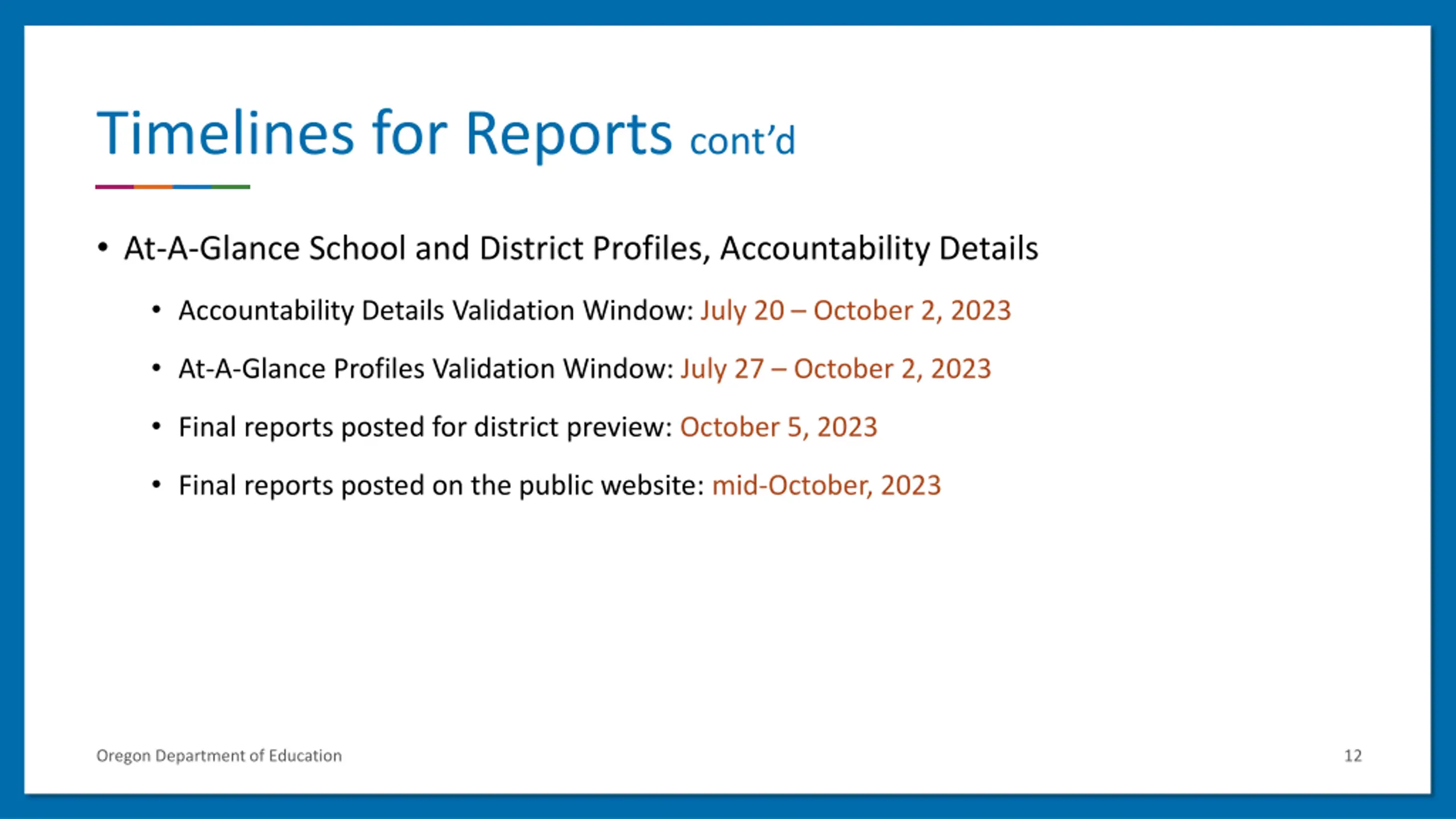 Timelines for Reports contd At-A-Glance School and District Profiles, Accountability Details Accountability Details Validation Window: July 20 October 2, 2023 At-A-Glance Profiles Validation Window: July 27 October 2, 2023 Final reports posted for district preview: October 5, 2023 Final reports posted on the public website: mid-October, 2023 Oregon Department of Education 12