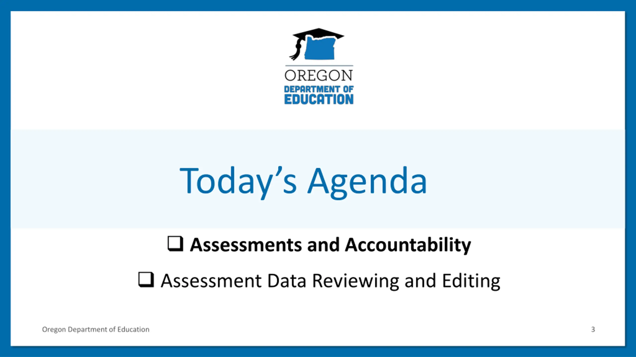 Todays Agenda 1 Assessments and Accountability Assessment Data Reviewing and Editing Oregon Department of Education 3