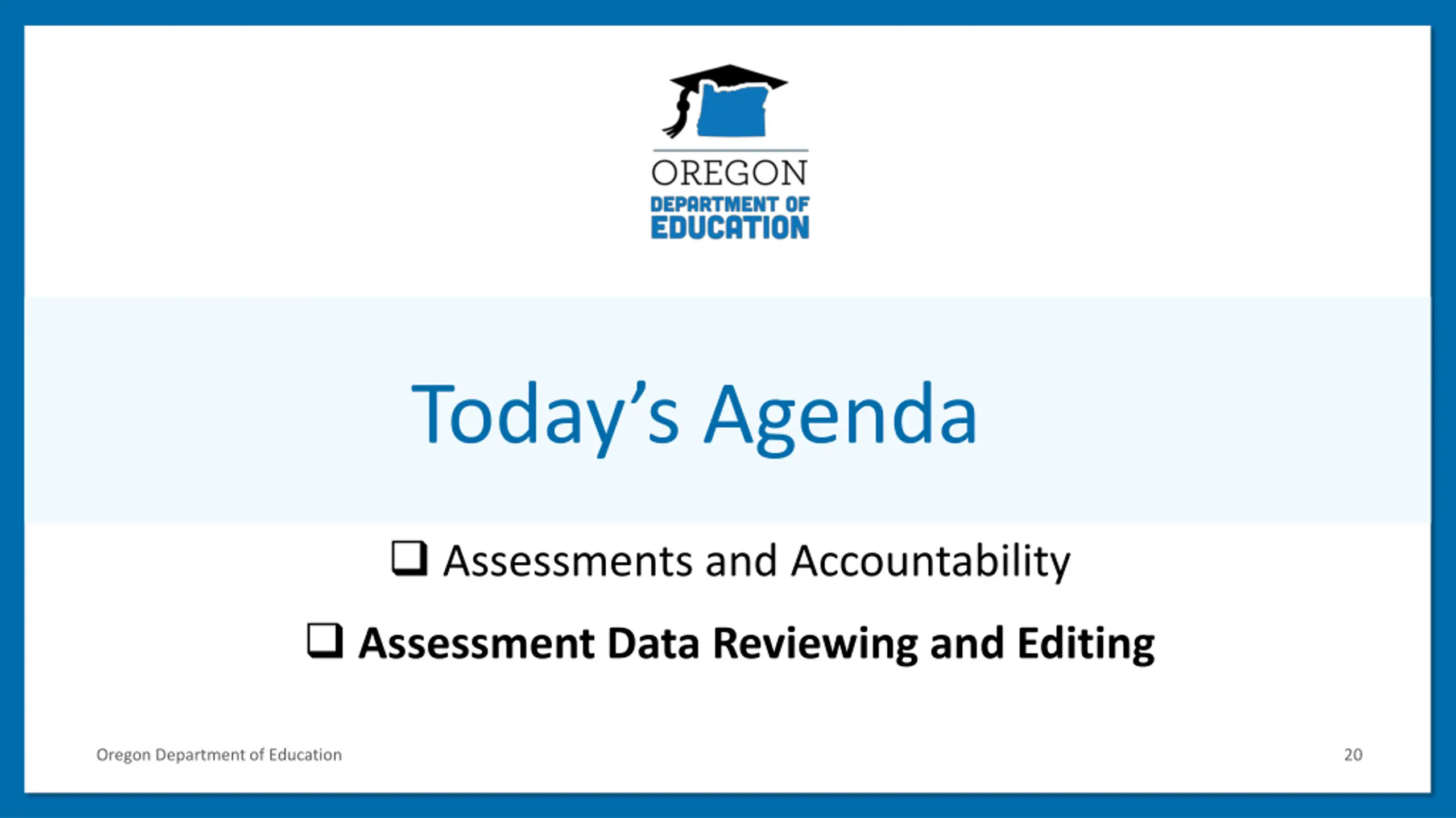 Todays Agenda 2 Assessments and Accountability Assessment Data Reviewing and Editing Oregon Department of Education 20