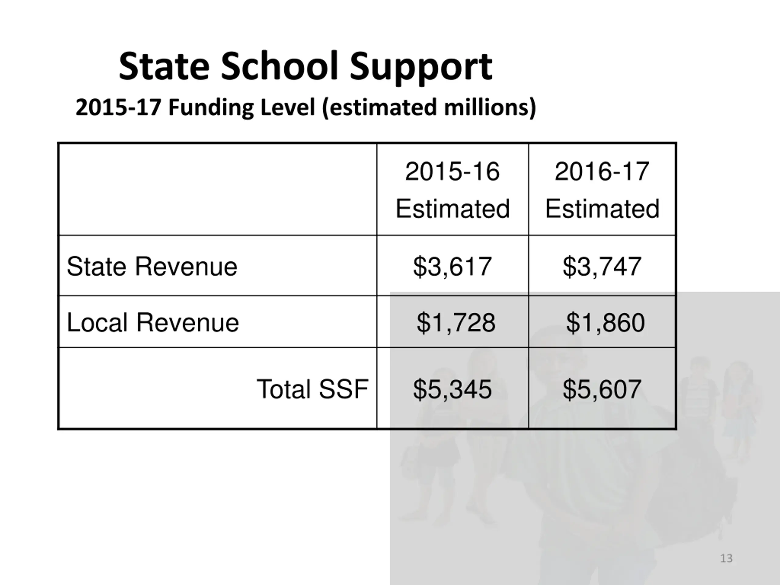 State School Support 2015-17 Funding Level (estimated millions) 2015-16 Estimated 2016-17 Estimated State Revenue $3,617 $3,747 Local Revenue $1,728 $1,860 Total SSF $5,345 $5,607 13