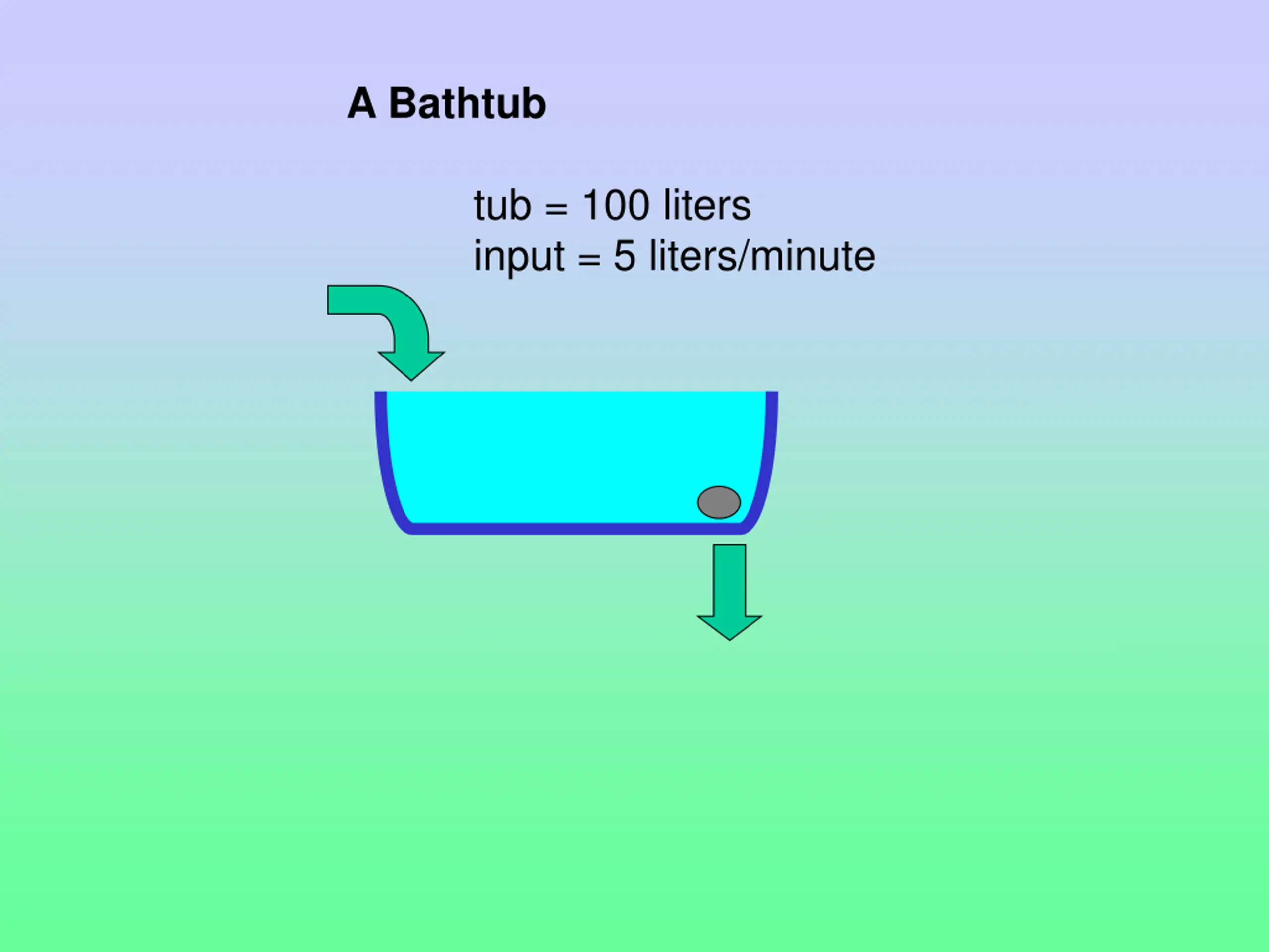 A Bathtub tub = 100 liters input = 5 liters/minute