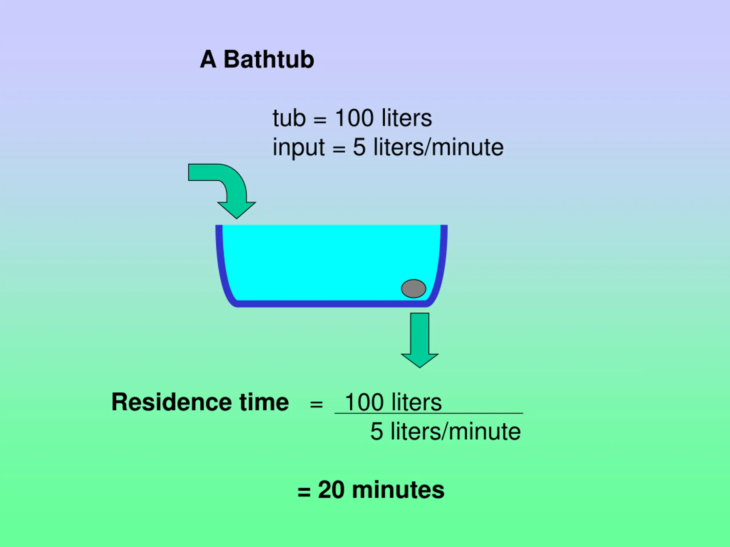 A Bathtub tub = 100 liters input = 5 liters/minute Residence time = 100 liters 5 liters/minute = 20 minutes
