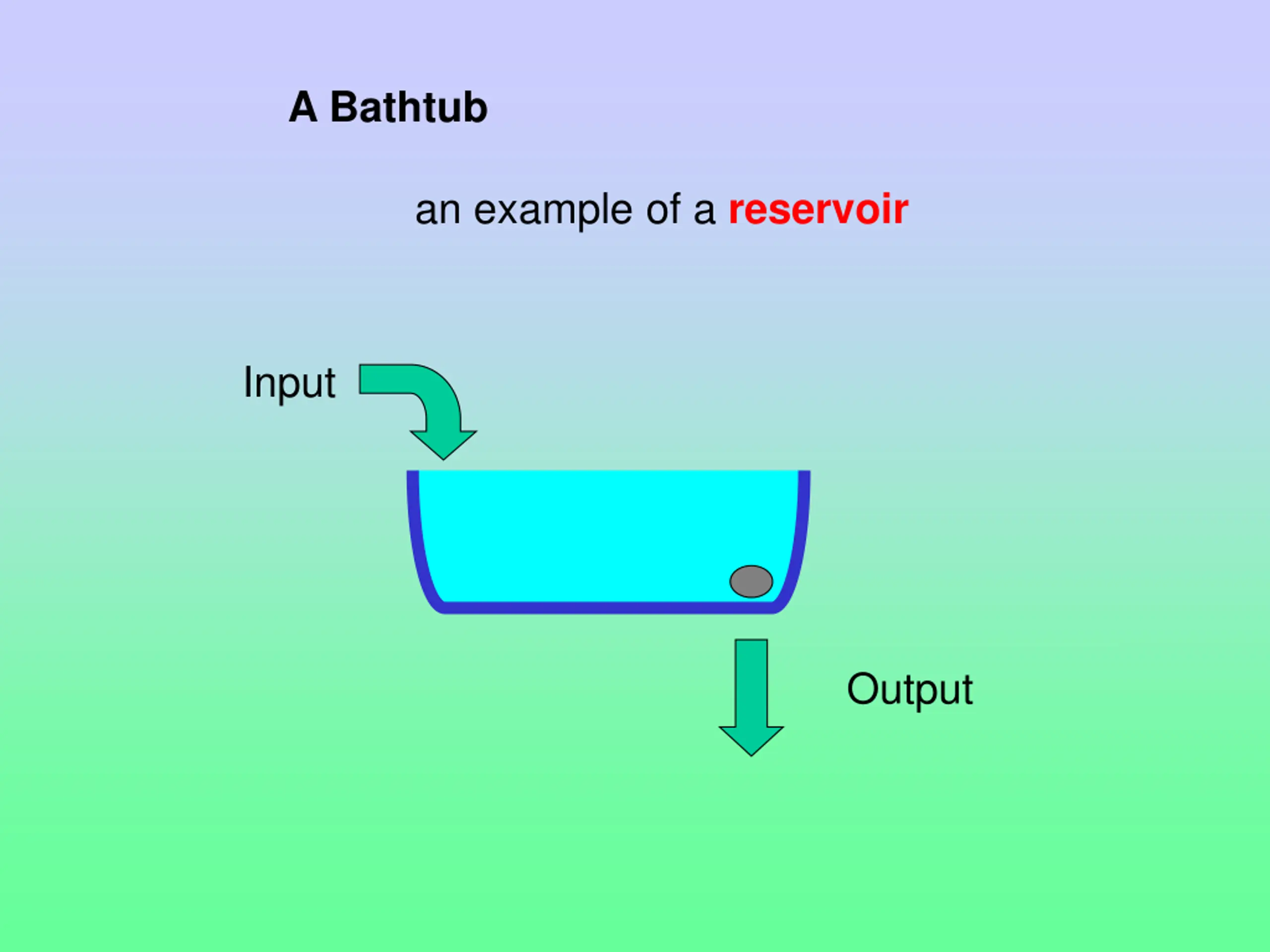 A Bathtub an example of a reservoir (the amount of water is the size of the reservoir) Input (flow of water into the tub) Output (flow of water out of the tub)
