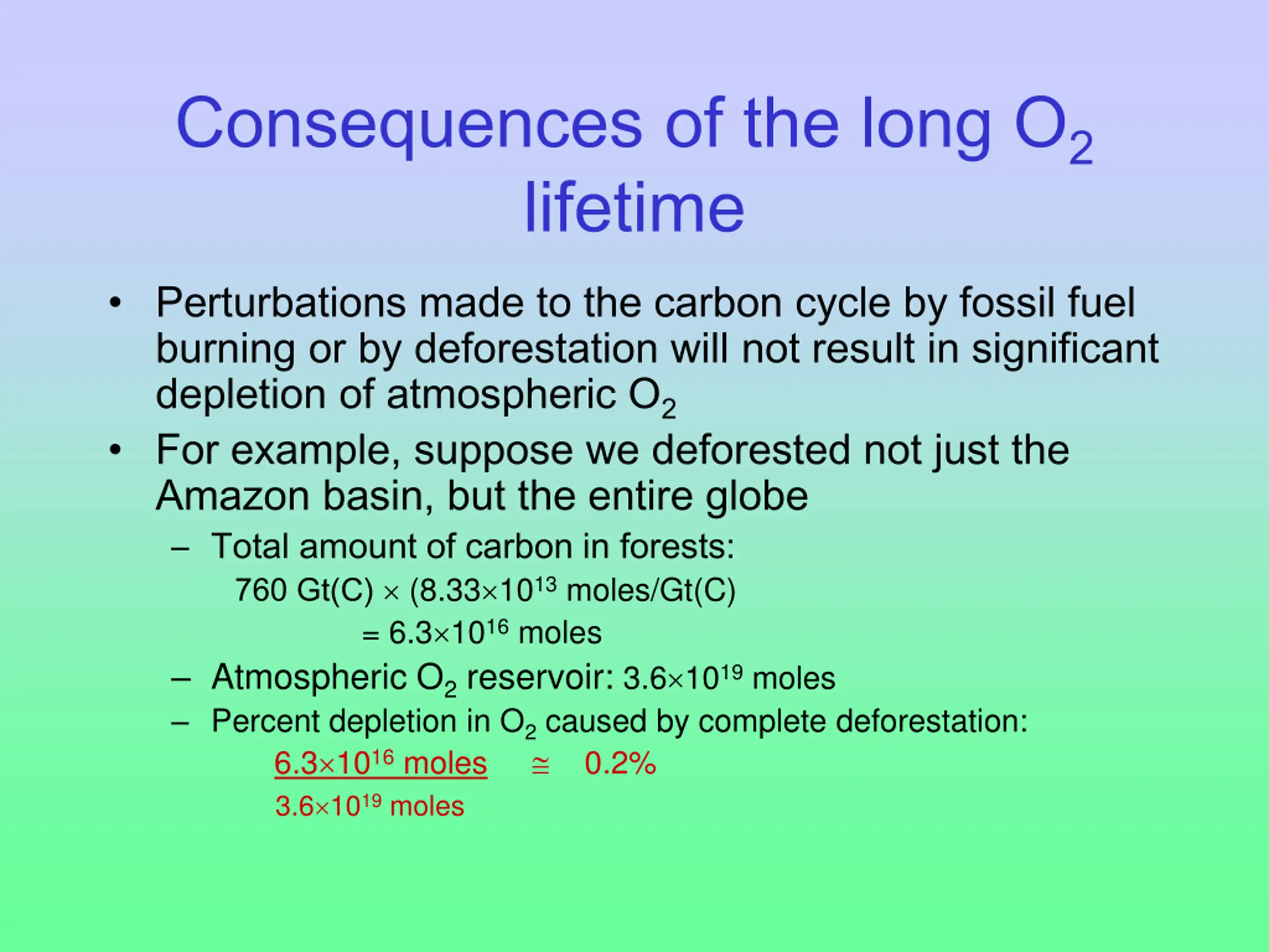 Consequences of the long O2 lifetime Perturbations made to the carbon cycle by fossil fuel burning or by deforestation will not result in significant depletion of atmospheric O2 For example, suppose we deforested not just the Amazon basin, but the entire globe Total amount of carbon in forests: 760 Gt(C) (8.33 1013 moles/Gt(C) = 6.3 1016 moles Atmospheric O2 reservoir: 3.6 1019 moles Percent depletion in O2 caused by complete deforestation: 6.3 1016 moles 0.2% 3.6 1019 moles