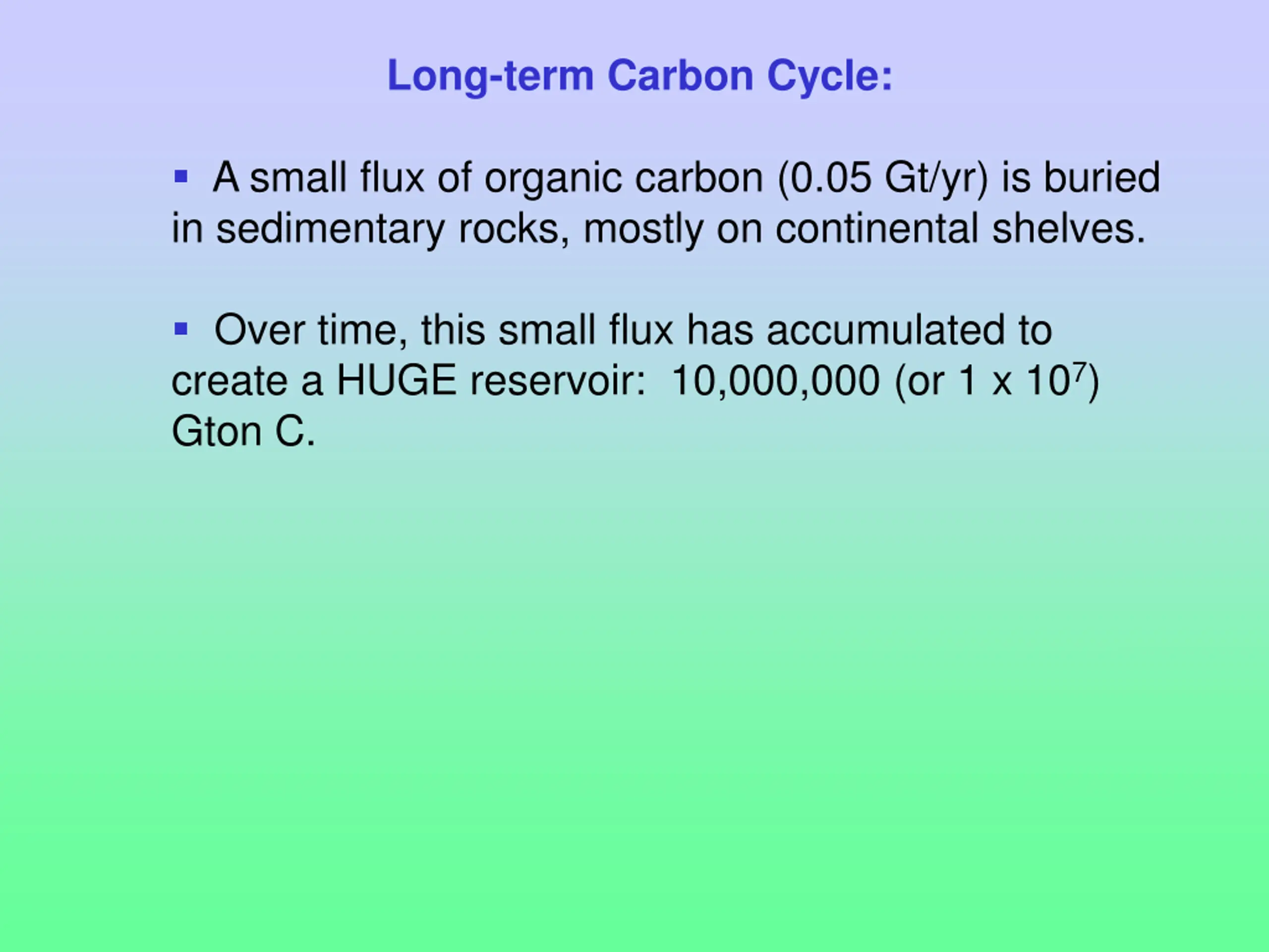 Long-term Carbon Cycle: A small flux of organic carbon (0.05 Gt/yr) is buried in sedimentary rocks, mostly on continental shelves. Over time, this small flux has accumulated to create a HUGE reservoir: 10,000,000 (or 1 x 107) Gton C.
