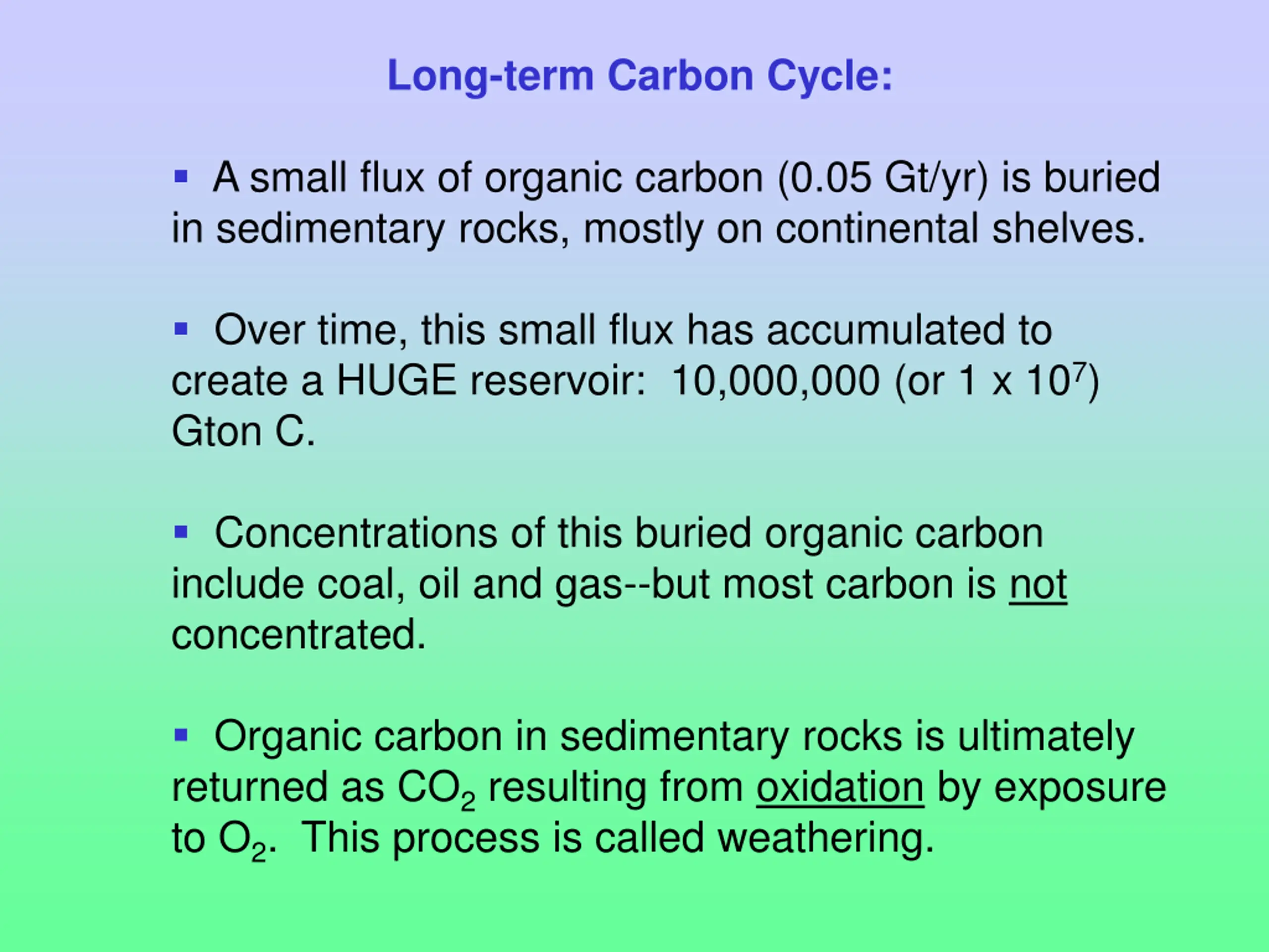 Long-term Carbon Cycle: A small flux of organic carbon (0.05 Gt/yr) is buried in sedimentary rocks, mostly on continental shelves. Over time, this small flux has accumulated to create a HUGE reservoir: 10,000,000 (or 1 x 107) Gton C. Concentrations of this buried organic carbon include coal, oil and gas--but most carbon is not concentrated. Organic carbon in sedimentary rocks is ultimately returned as CO2 resulting from oxidation by exposure to O2. This process is called weathering.
