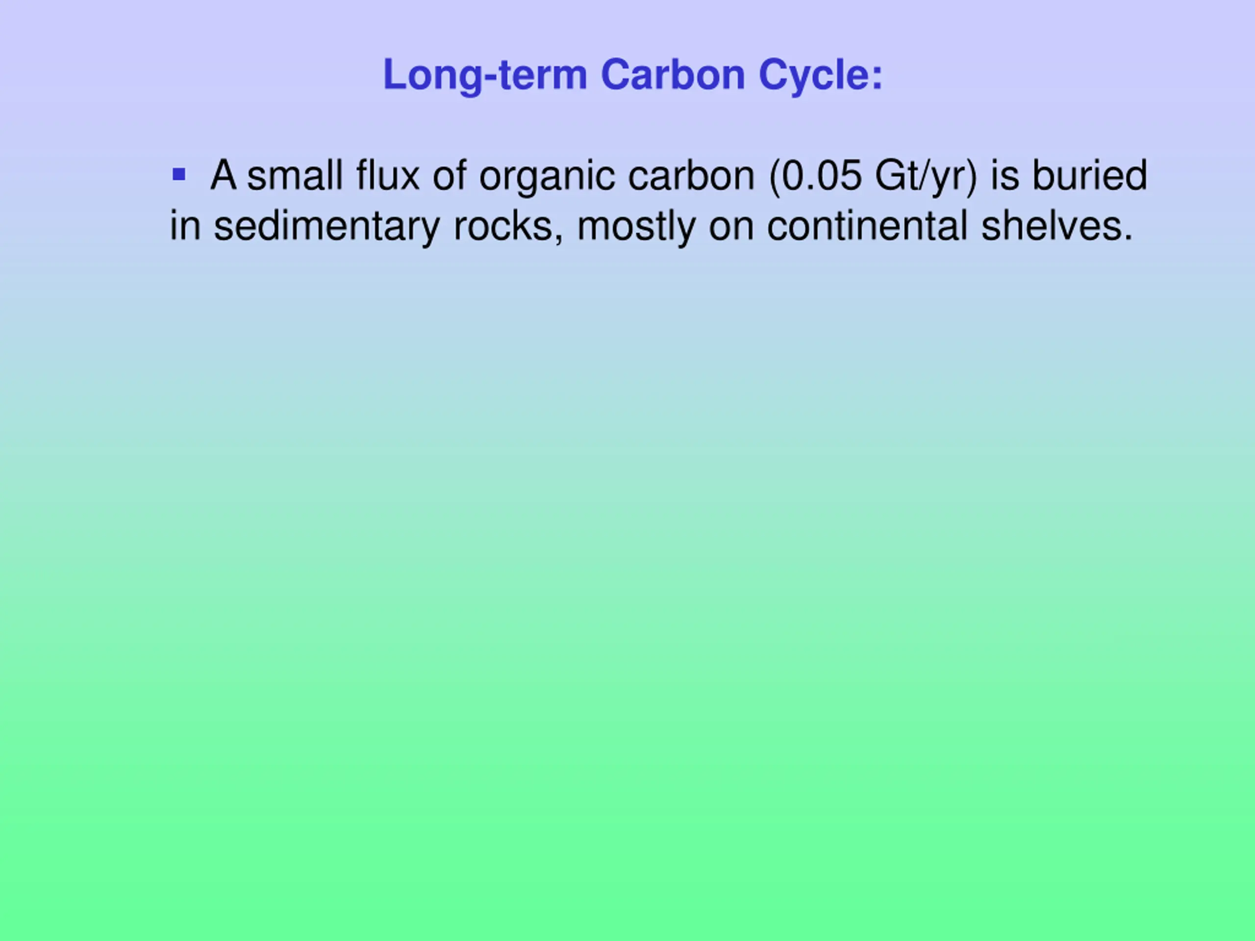 Long-term Carbon Cycle: A small flux of organic carbon (0.05 Gt/yr) is buried in sedimentary rocks, mostly on continental shelves.