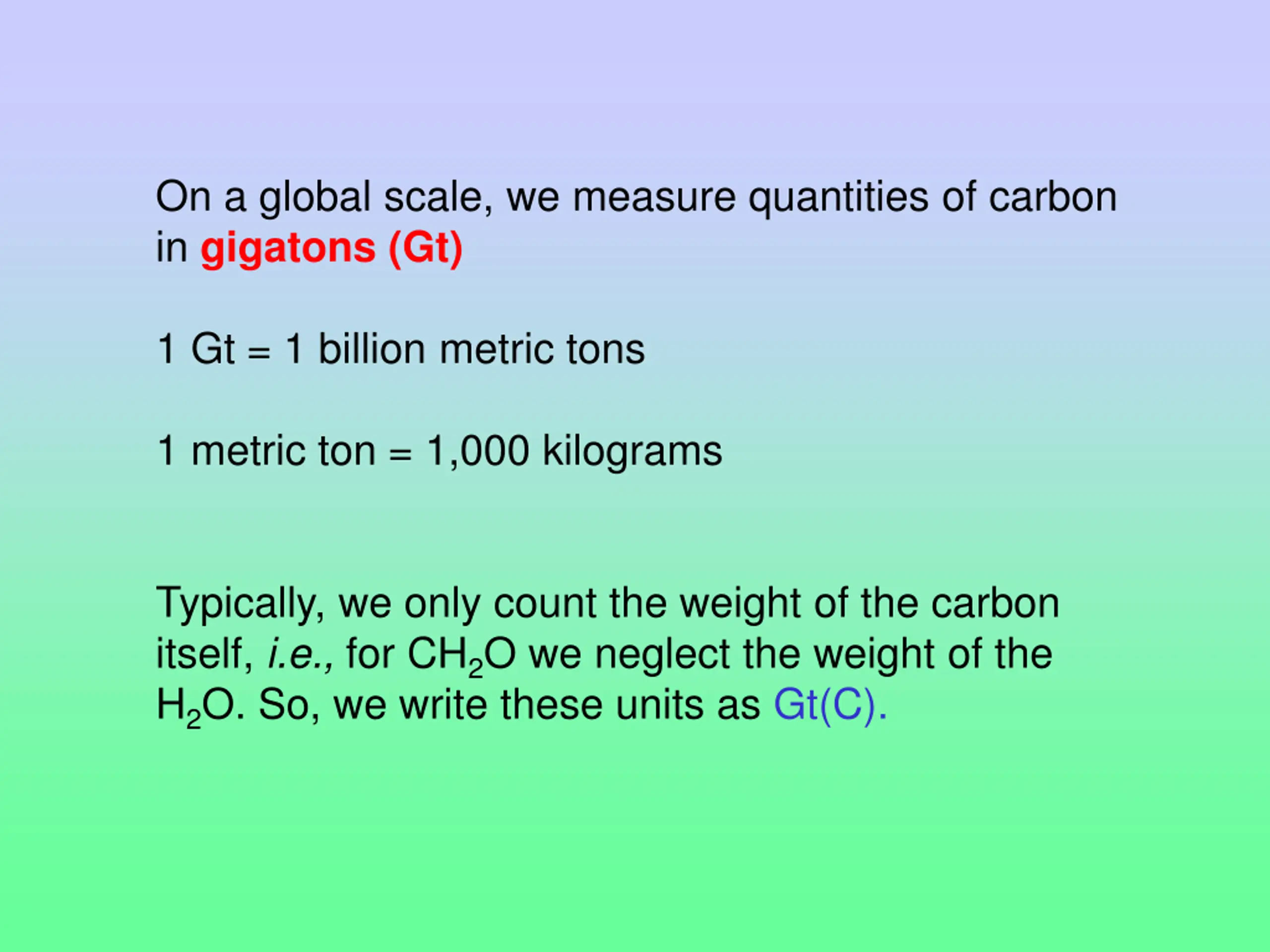On a global scale, we measure quantities of carbon in gigatons (Gt) 1 Gt = 1 billion metric tons 1 metric ton = 1,000 kilograms Typically, we only count the weight of the carbon itself, i.e., for CH2O we neglect the weight of the H2O. So, we write these units as Gt(C).
