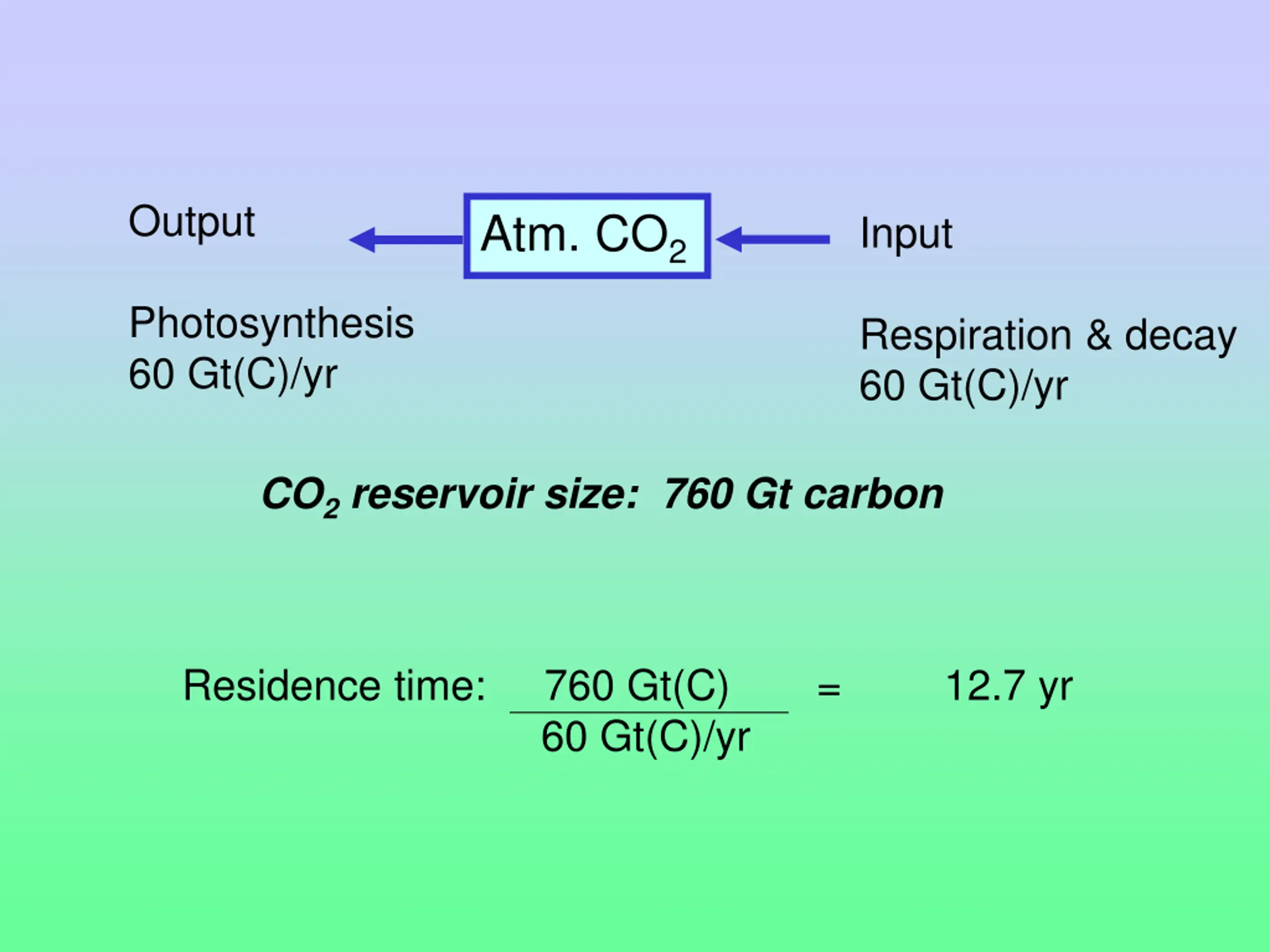 Output Atm. CO2 Input Photosynthesis 60 Gt(C)/yr Respiration & decay 60 Gt(C)/yr CO2 reservoir size: 760 Gt carbon Residence time: 760 Gt(C) 60 Gt(C)/yr = 12.7 yr