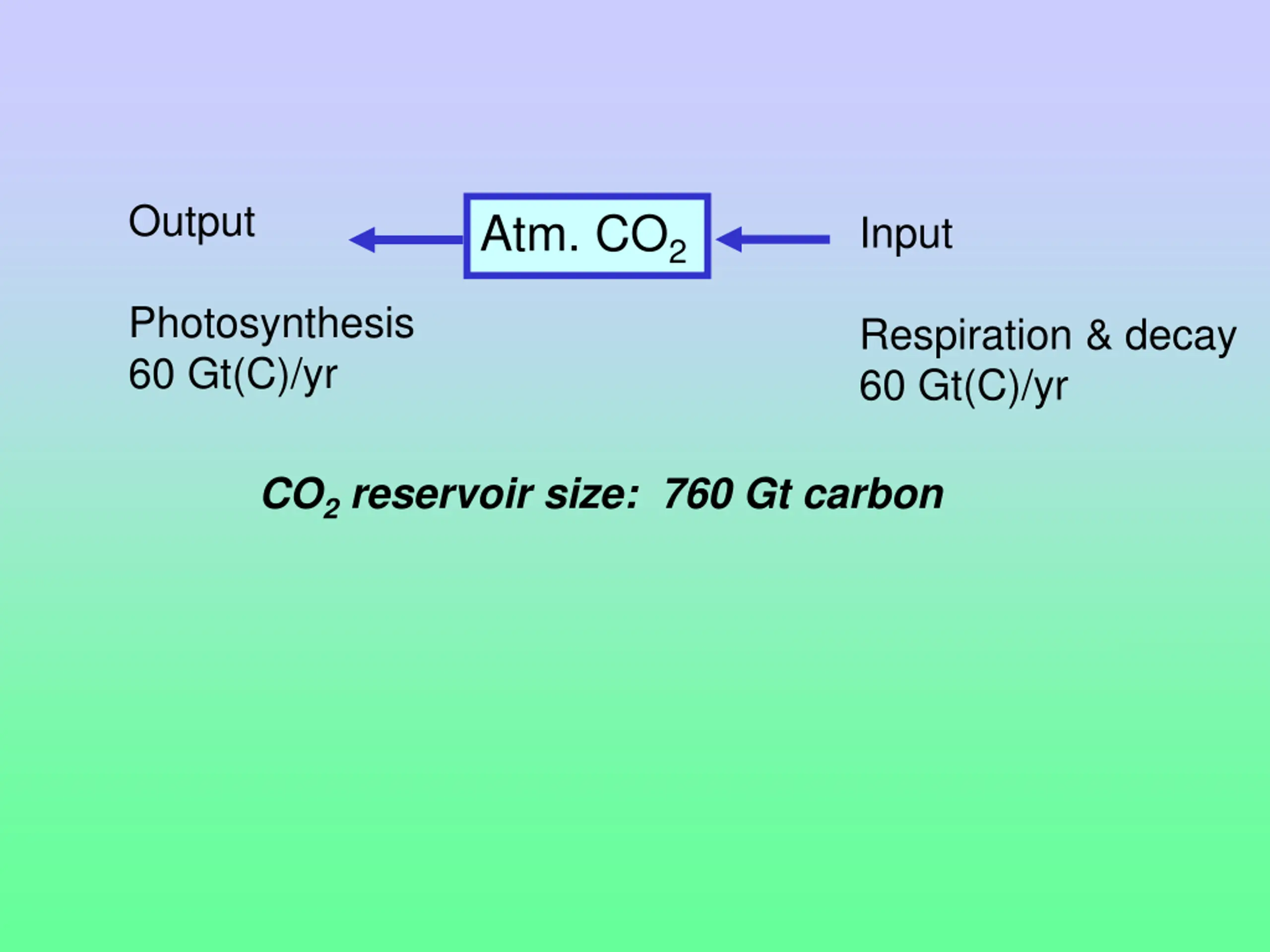 Output Atm. CO2 Input Photosynthesis 60 Gt(C)/yr Respiration & decay 60 Gt(C)/yr CO2 reservoir size: 760 Gt carbon