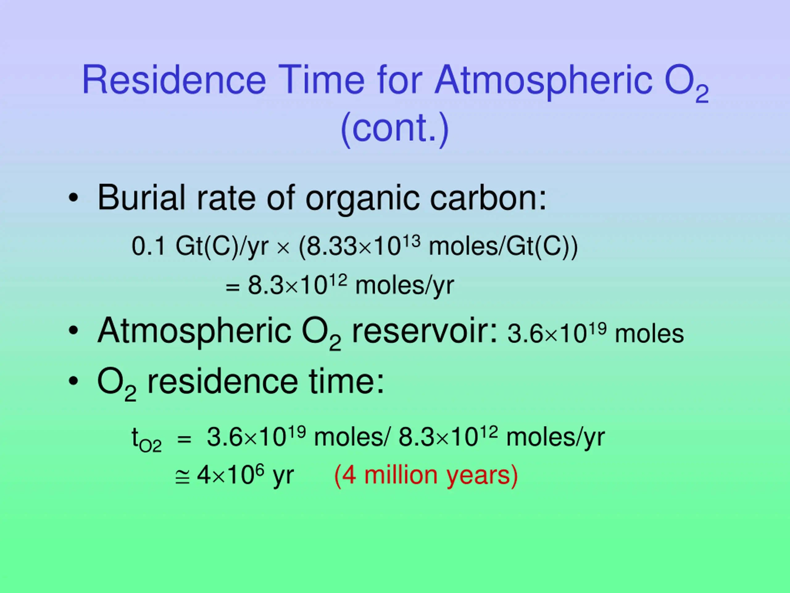 Residence Time for Atmospheric O2 (cont.) Burial rate of organic carbon: 0.1 Gt(C)/yr (8.33 1013 moles/Gt(C)) = 8.3 1012 moles/yr Atmospheric O2 reservoir: 3.6 1019 moles O2 residence time: tO2 = 3.6 1019 moles/ 8.3 1012 moles/yr 4 106 yr (4 million years)