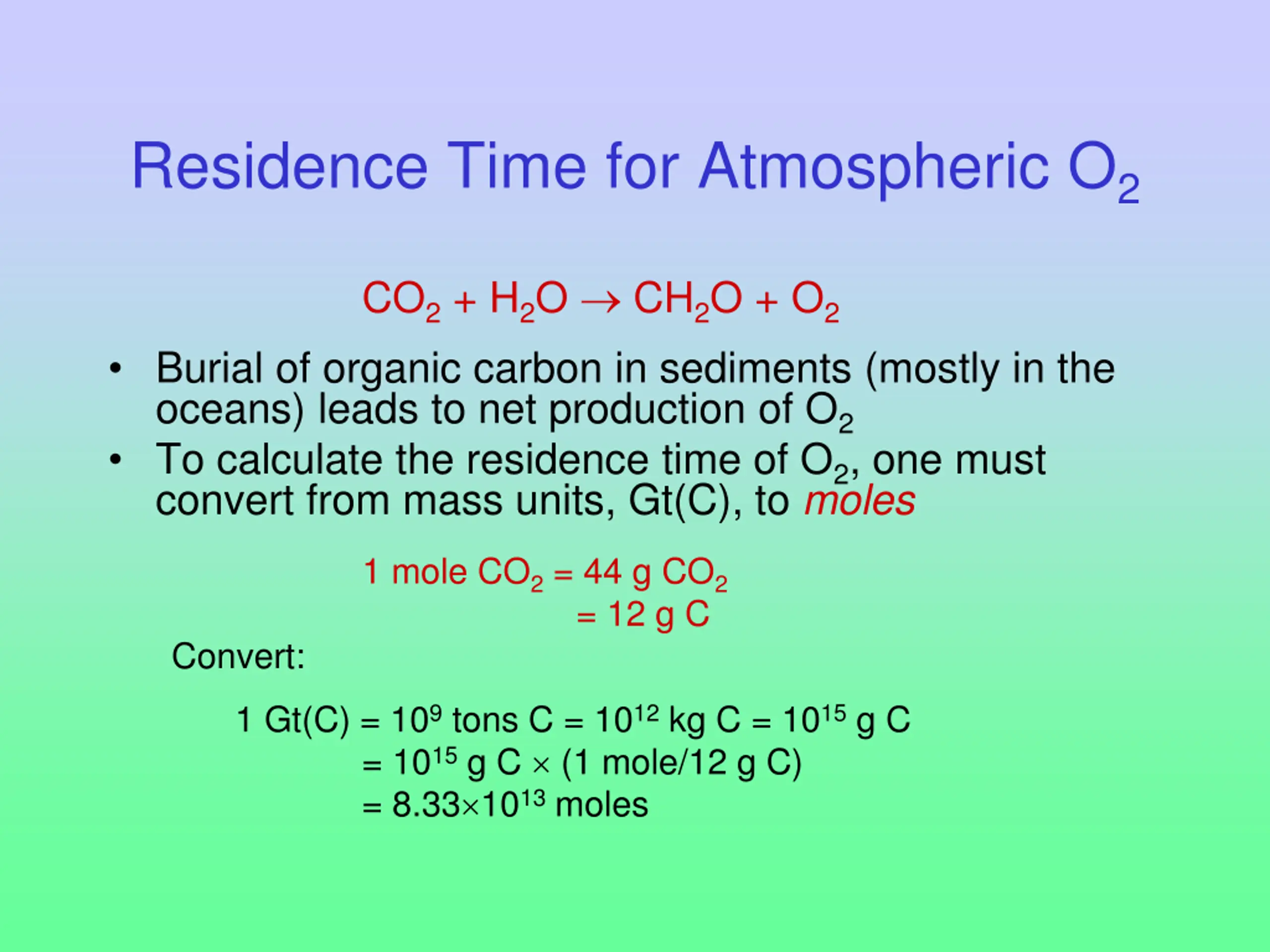 Residence Time for Atmospheric O2 CO2 + H2O CH2O + O2 Burial of organic carbon in sediments (mostly in the oceans) leads to net production of O2 To calculate the residence time of O2, one must convert from mass units, Gt(C), to moles Convert: 1 mole CO2 = 44 g CO2 = 12 g C 1 Gt(C) = 109 tons C = 1012 kg C = 1015 g C = 1015 g C (1 mole/12 g C) = 8.33 1013 moles