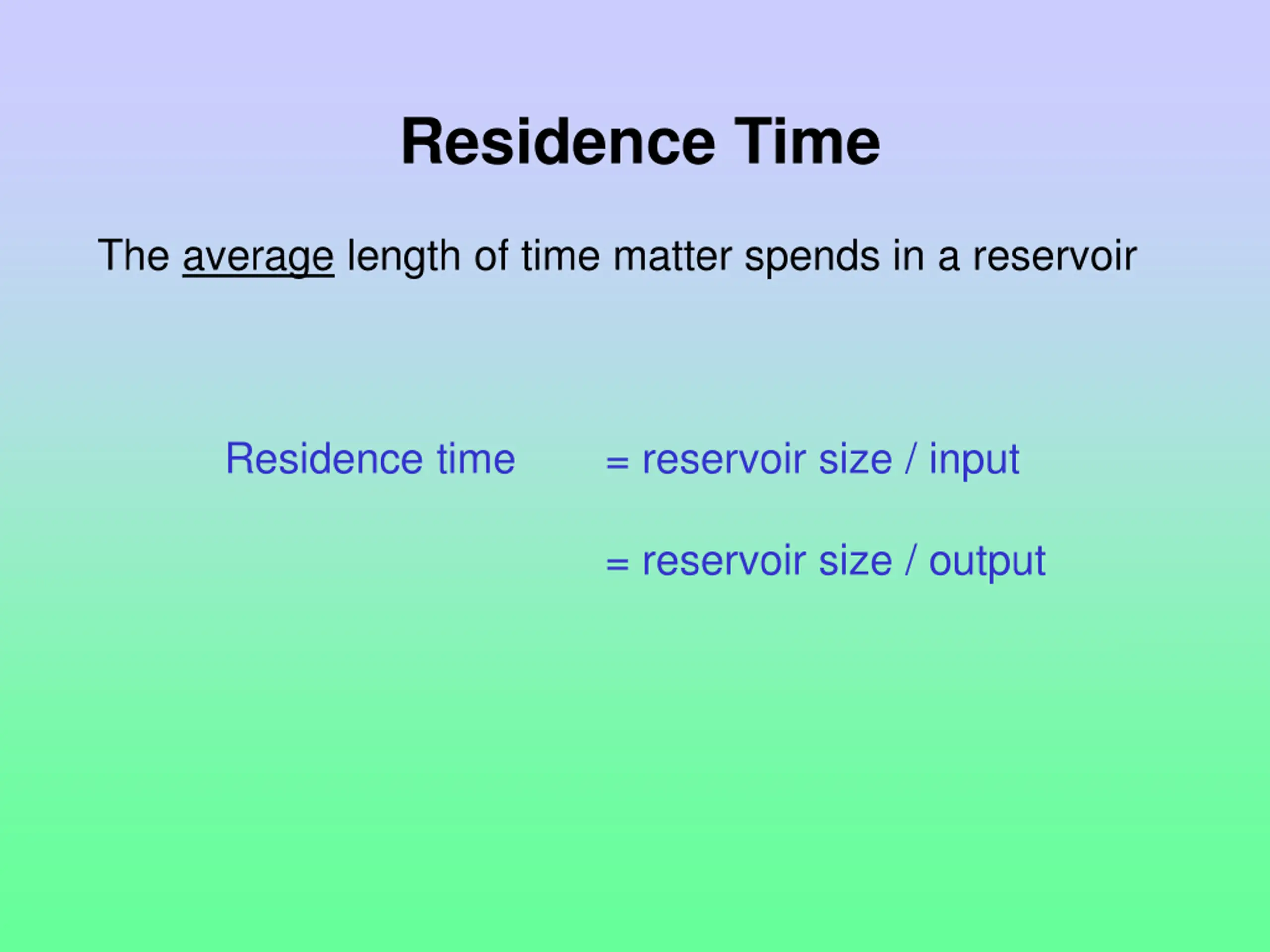 Residence Time The average length of time matter spends in a reservoir Residence time = reservoir size / input = reservoir size / output
