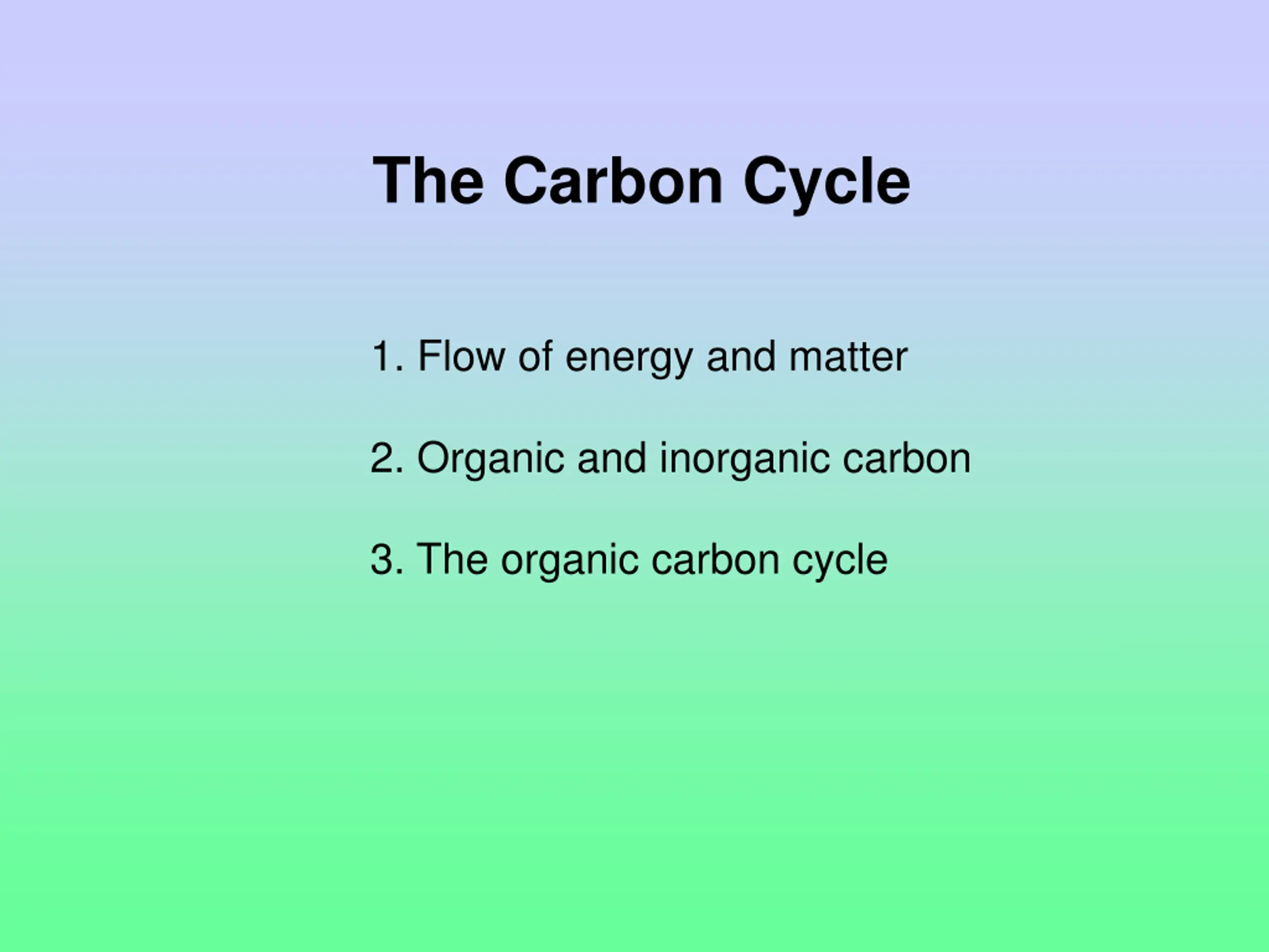 The Carbon Cycle 1. Flow of energy and matter 2. Organic and inorganic carbon 3. The organic carbon cycle
