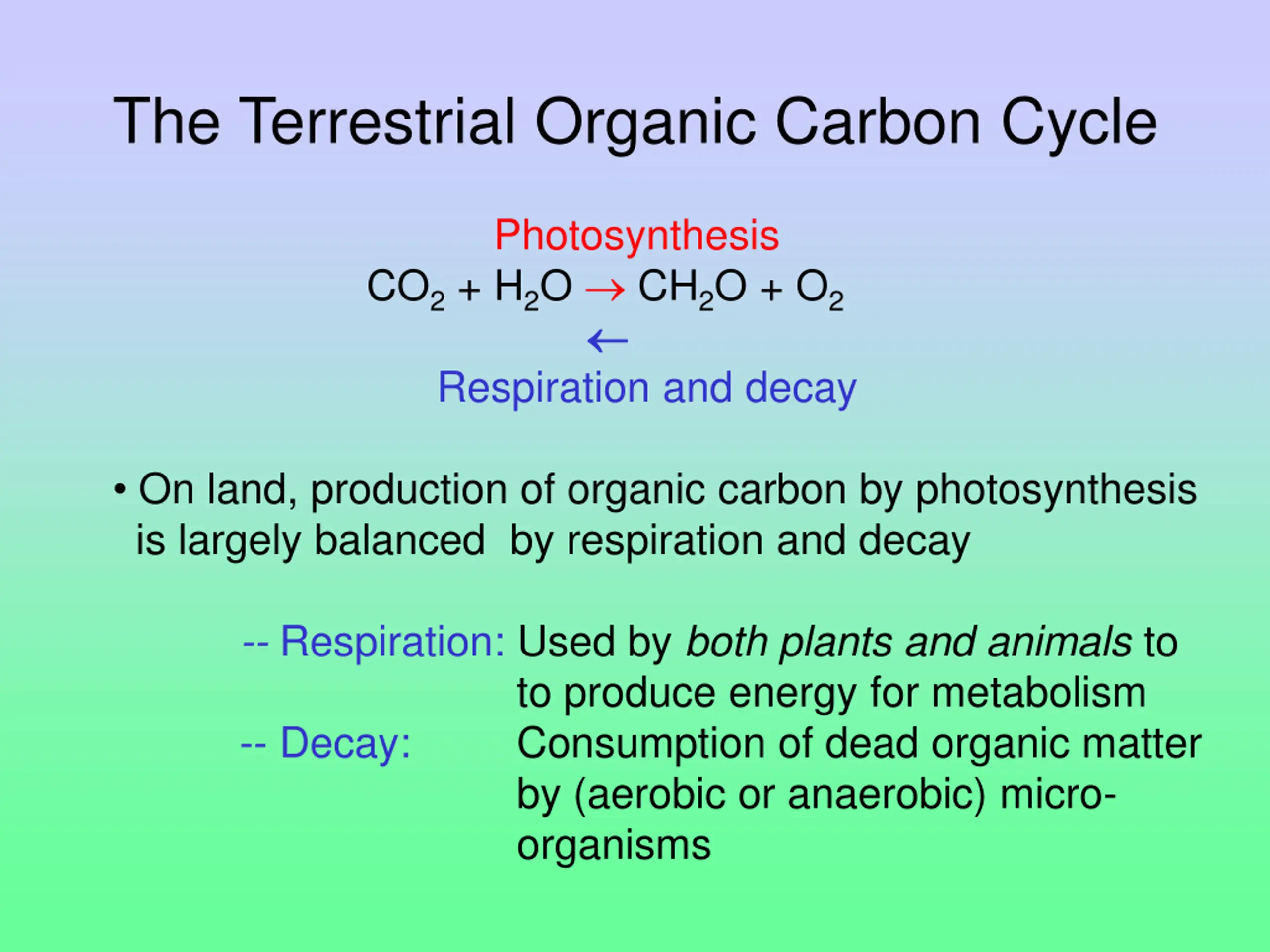 The Terrestrial Organic Carbon Cycle CO2 + H2O CH2O + O2 Respiration and decay Photosynthesis On land, production of organic carbon by photosynthesis is largely balanced by respiration and decay -- Respiration: Used by both plants and animals to to produce energy for metabolism -- Decay: Consumption of dead organic matter by (aerobic or anaerobic) micro- organisms