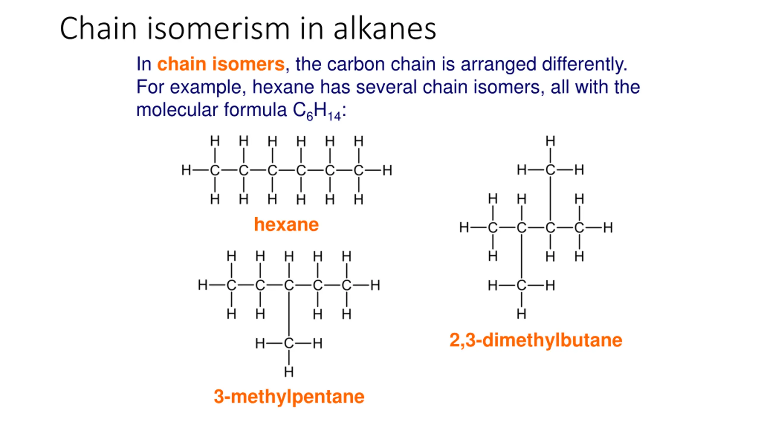 Chain isomerism in alkanes In chain isomers, the carbon chain is arranged differently. For example, hexane has several chain isomers, all with the molecular formula C6H14: hexane 2,3-dimethylbutane 3-methylpentane