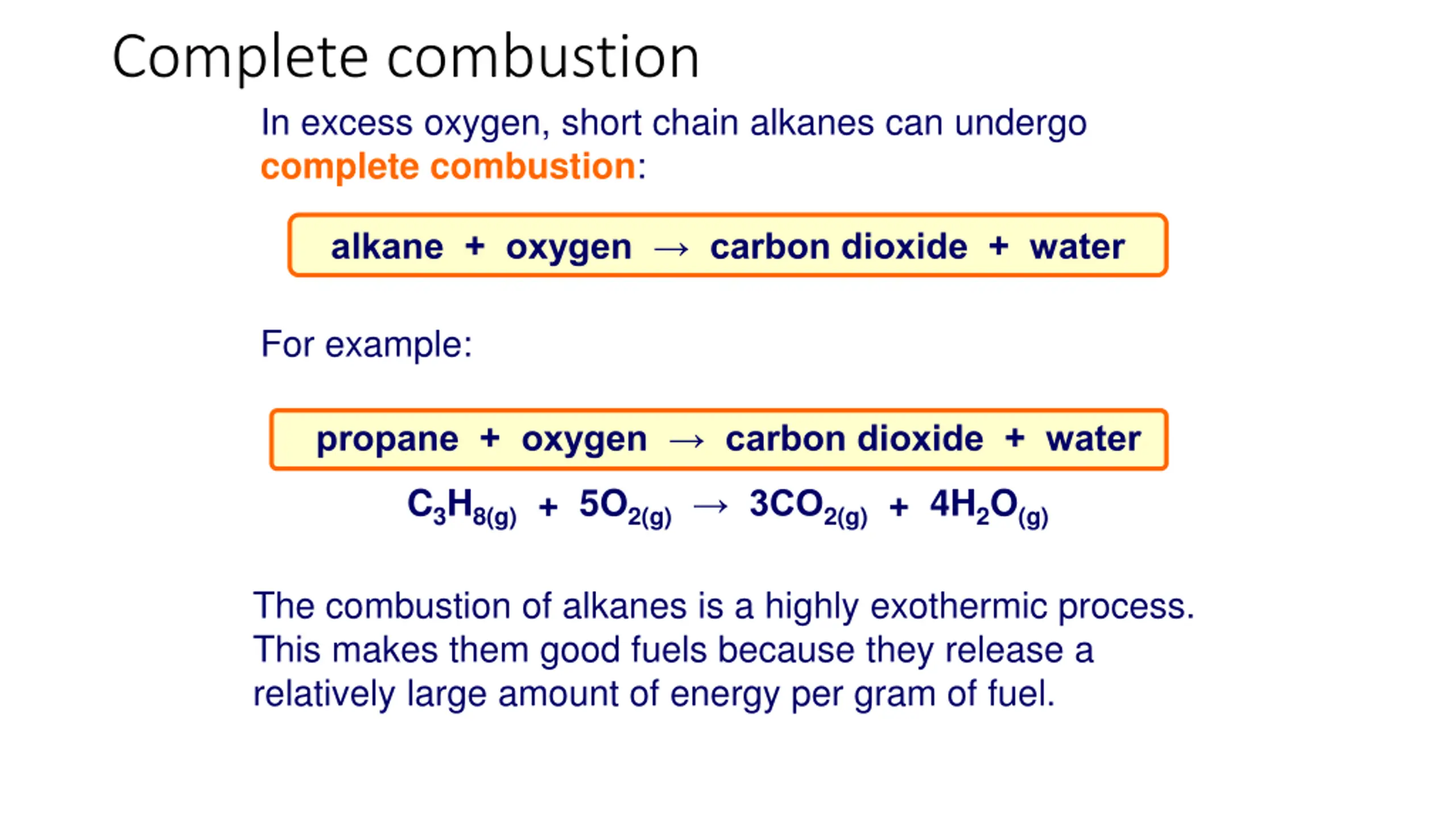 Complete combustion In excess oxygen, short chain alkanes can undergo complete combustion: alkane + oxygen carbon dioxide + water For example: propane + oxygen carbon dioxide + water C3H8(g) + 5O2(g) 3CO2(g) + 4H2O(g) The combustion of alkanes is a highly exothermic process. This makes them good fuels because they release a relatively large amount of energy per gram of fuel.
